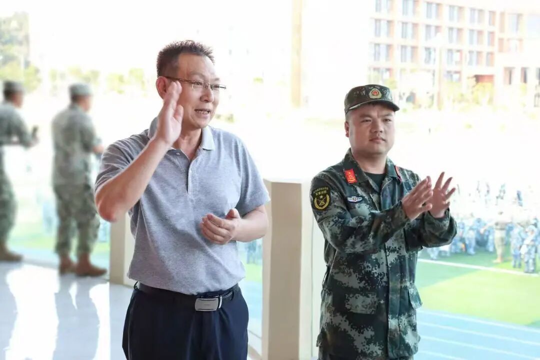 在训练场主席台上,学院领导一行驻足观看学生们的训练情况,对同学们整齐的队列、饱满的精神状态表示赞许。在详细了解训练进度后,领导们与教官、辅导员亲切交流,高度肯定了前者严谨科学的施训方法与后者细致入微的陪伴关怀,并代表学院表达了对大家辛勤付出的衷心感谢。现场气氛温馨融洽,展现了学院上下团结一致、共促军训顺利推进的良好风貌。