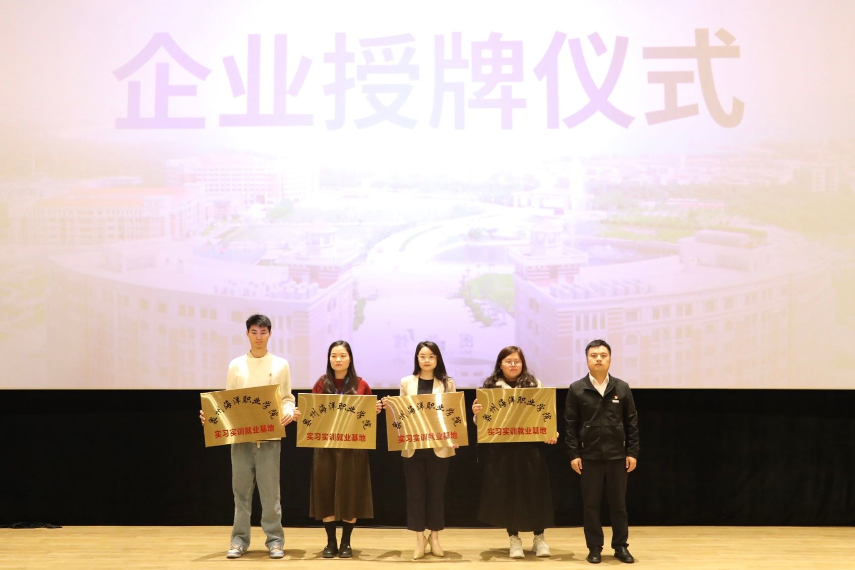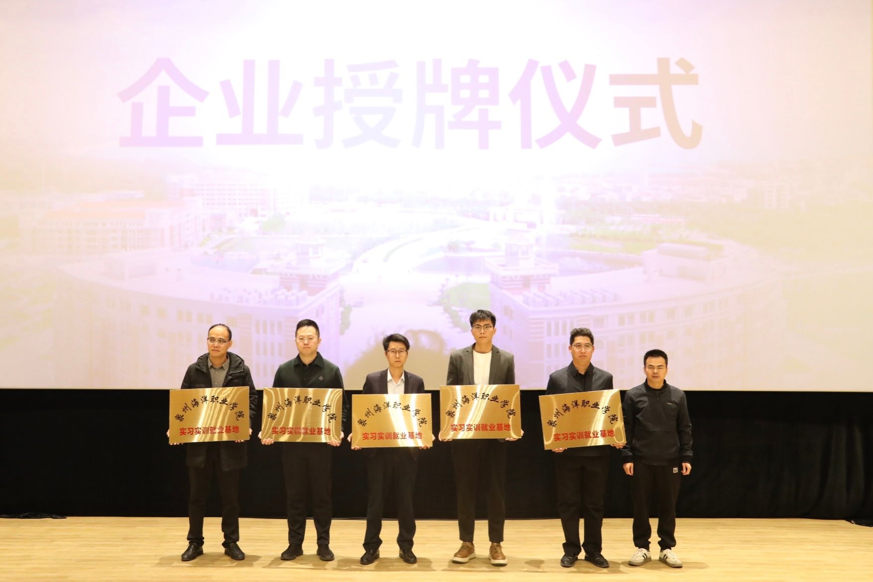 信息工程学院院长贾超、党总支书记陈合喜、对外合作处副处长蒋滨滨、对外中心主任郑天明为福建福莱航空科技有限公司、鸿官通信工程有限公司、厦门以来科技有限公司等22家合作企业授予“泉州海洋职业学院实习实训就业基地”牌匾,为信息工程学院学子提供更广阔、更专业的实践平台,打通从理论学习到岗位实战的“最后一公里”。