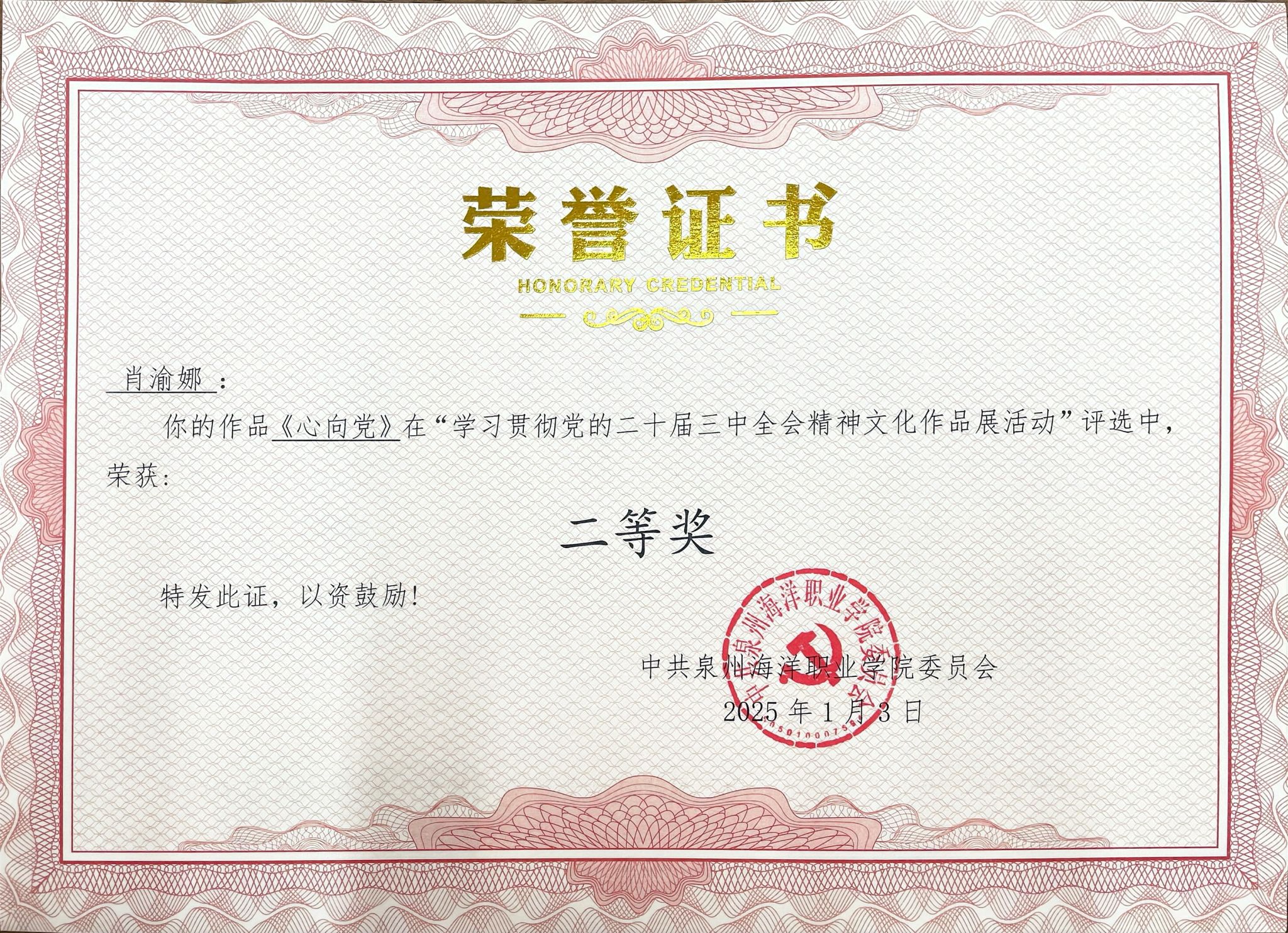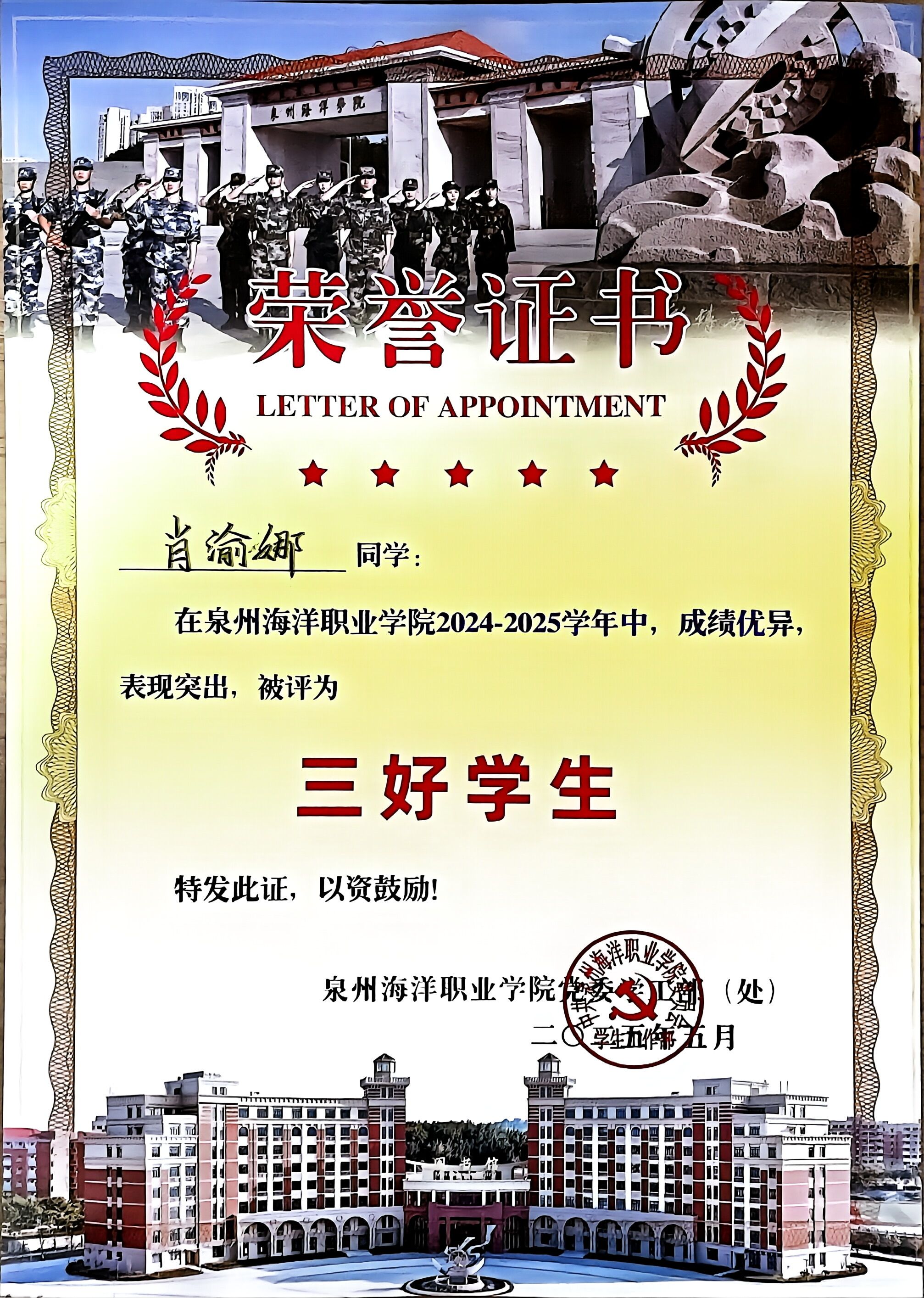 肖渝娜,女,共青团员,健康休闲学院护理2402班团支书,兼任院团委平安校园青年服务队第一负责人。2024—2025学年专业成绩排名2/590,综合测评成绩排名2/590。曾获泉州海洋职业学院“三好学生”、中国国际创新大赛(2025)泉州海洋职业学院校级金奖、泉州海洋职业学院“传习中华优秀传统文化 感悟党的二十届三中全会精神”活动二等奖、石狮市第七届校园心理情景剧大赛中荣获“三等奖”等奖项。持有护士执业资格证、普通话二甲证书。志愿服务时长204小时。