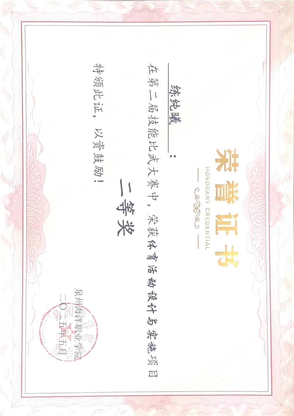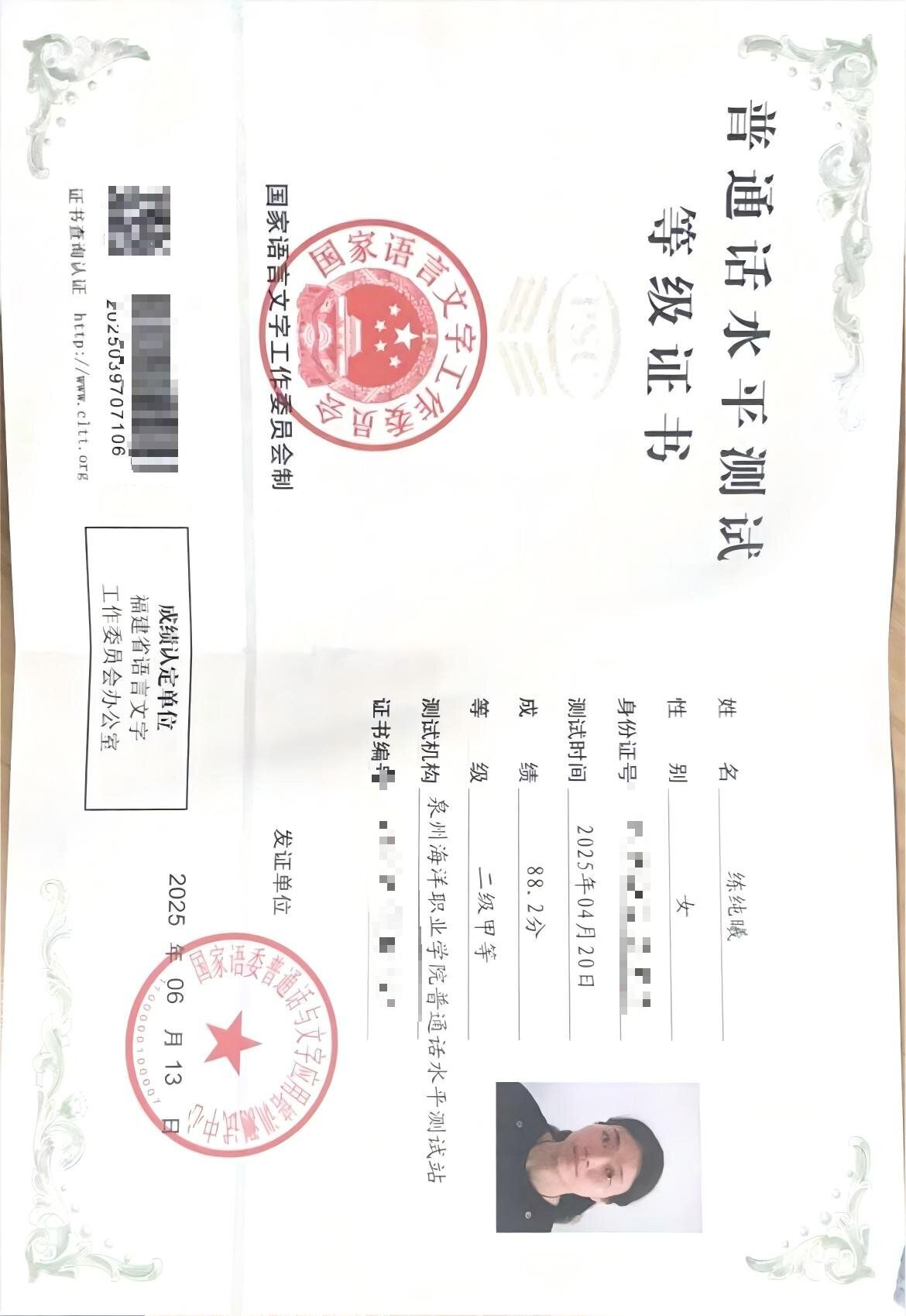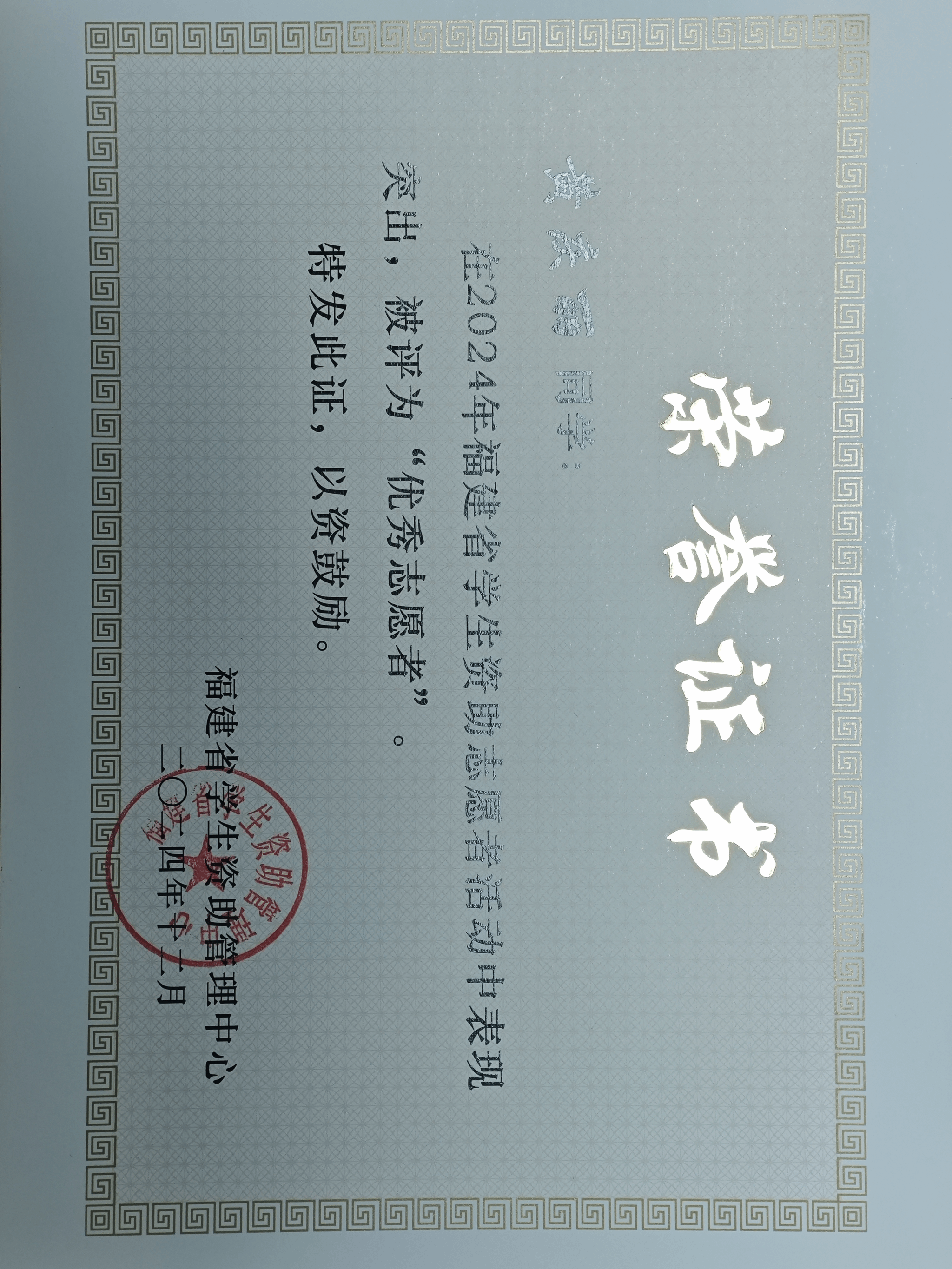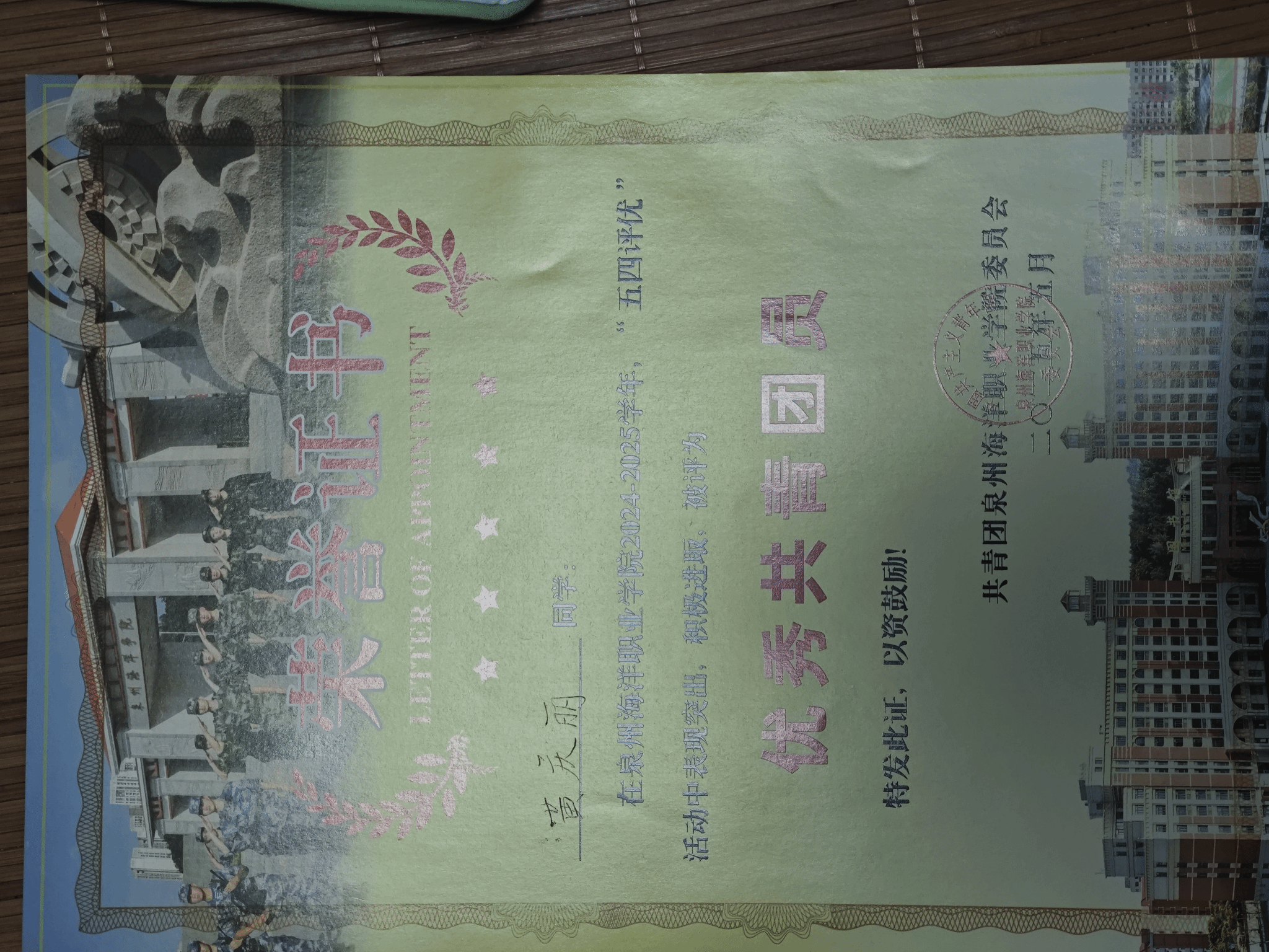 黄庆丽,女,共青团员,2024-2025学年专业成绩排名5/156,综合测评成绩排名3/156,曾获泉州海洋职业学院“优秀共青团员”“优秀学生标兵”“福建省优秀志愿者”“女子1500米第二名”“校运会女子4×400第一名”等奖项。志愿服务时长共361小时。