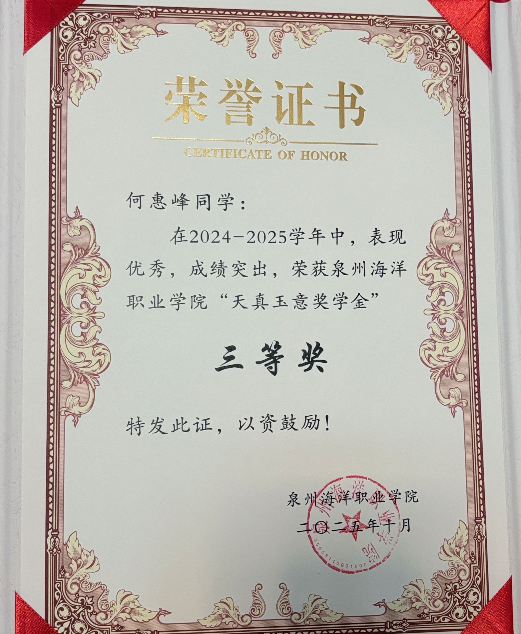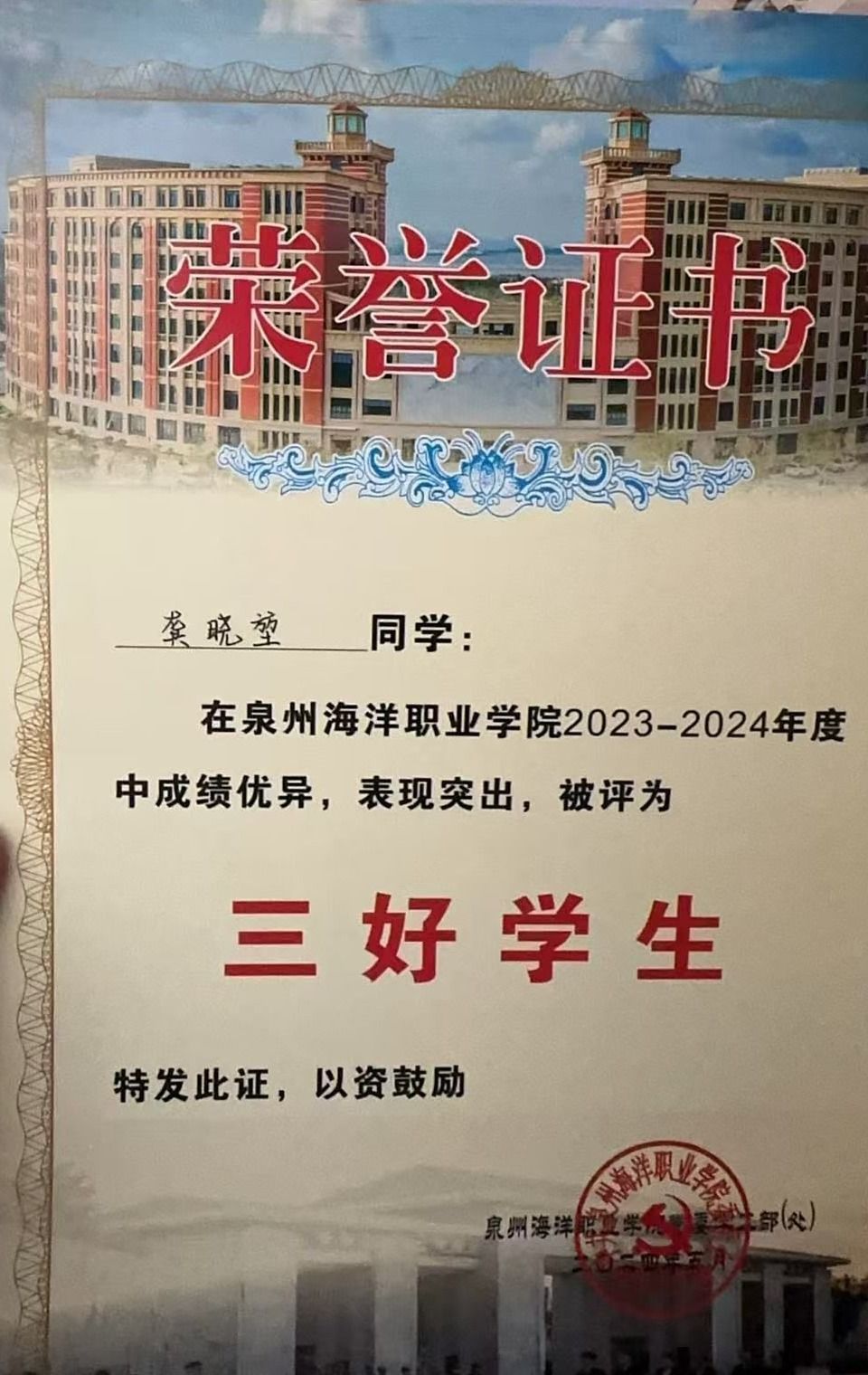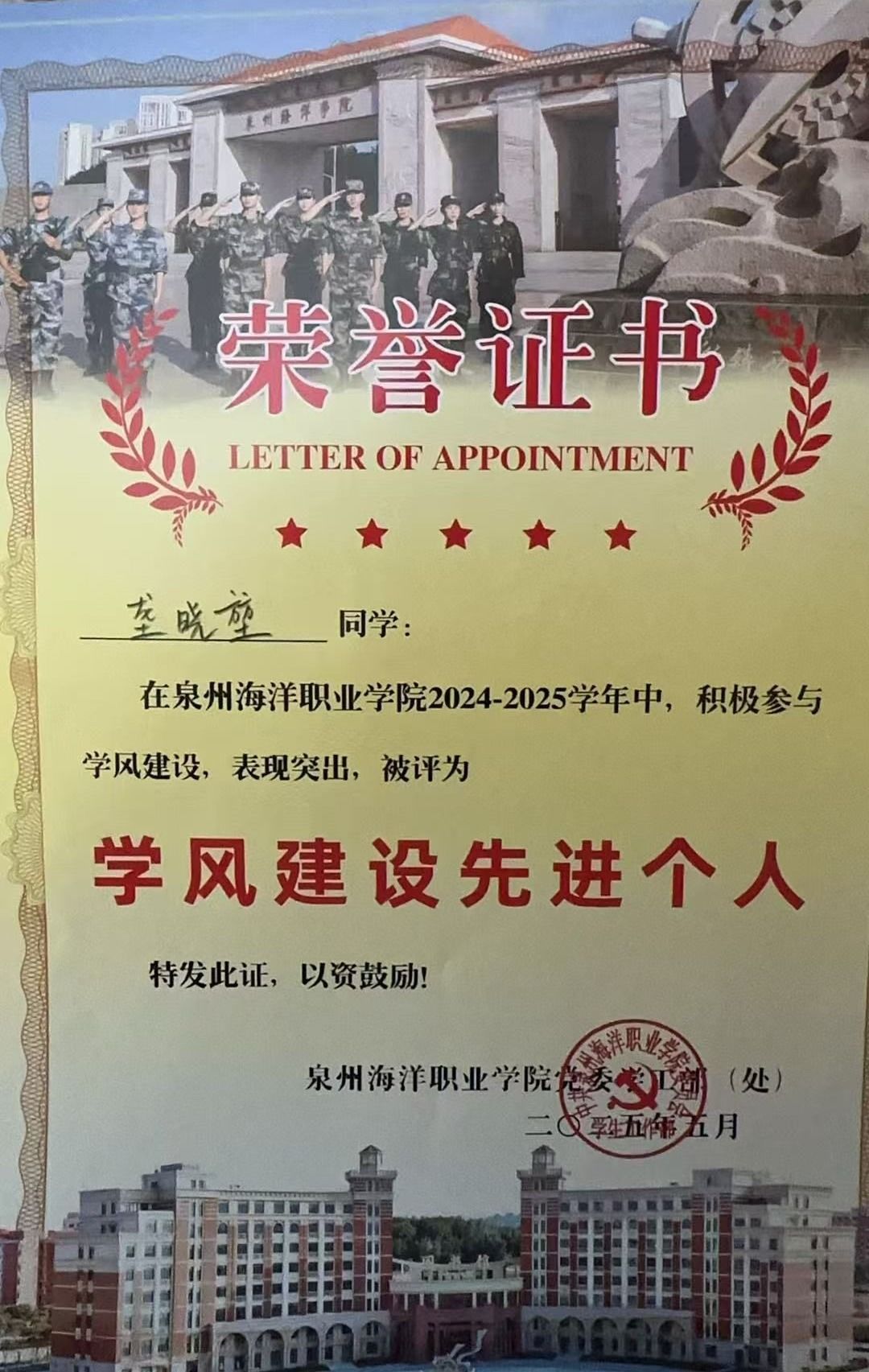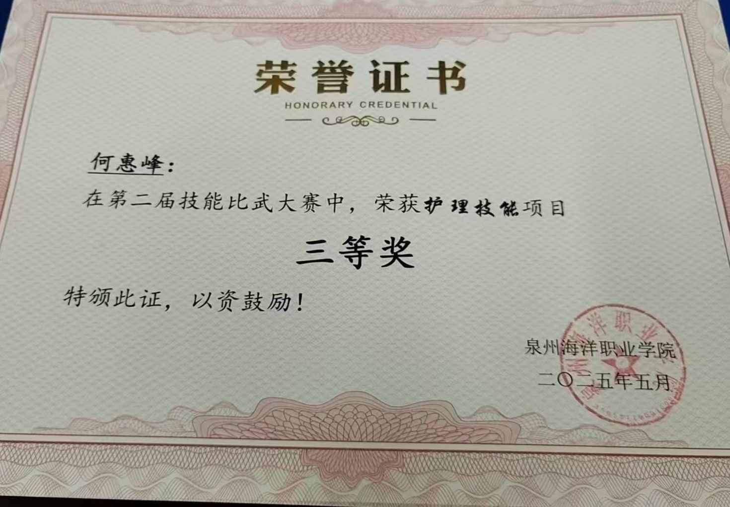 何惠峰,女,共青团员,健康休闲学院护理2307班学生。2024—2025学年专业成绩17/530,综合测评成绩排名5/530。曾获福建省职业院校技能大赛高职组婴幼儿健康养育照护团体优秀奖、泉州海洋职业学院第二届技能比武大赛婴幼儿照护项目三等奖、护理技能项目三等奖、2024—2025学年“优秀学生标兵”等荣誉。持有红十字救护员证、养老护理员证、计算机一级等级等证书。志愿服务时长达100小时。