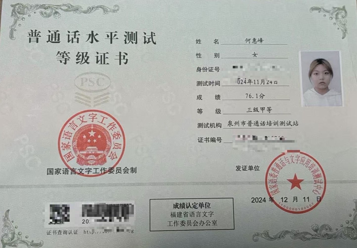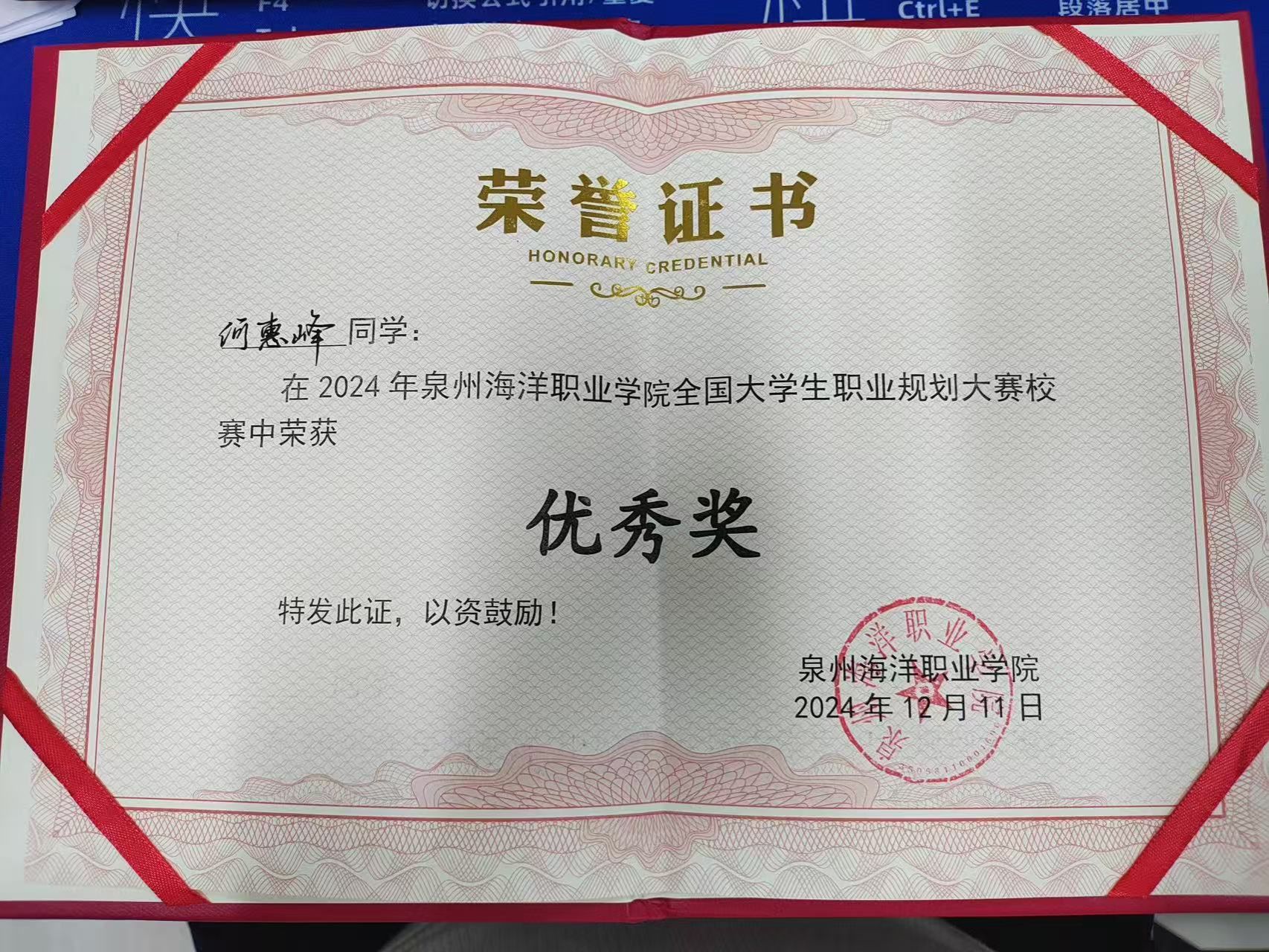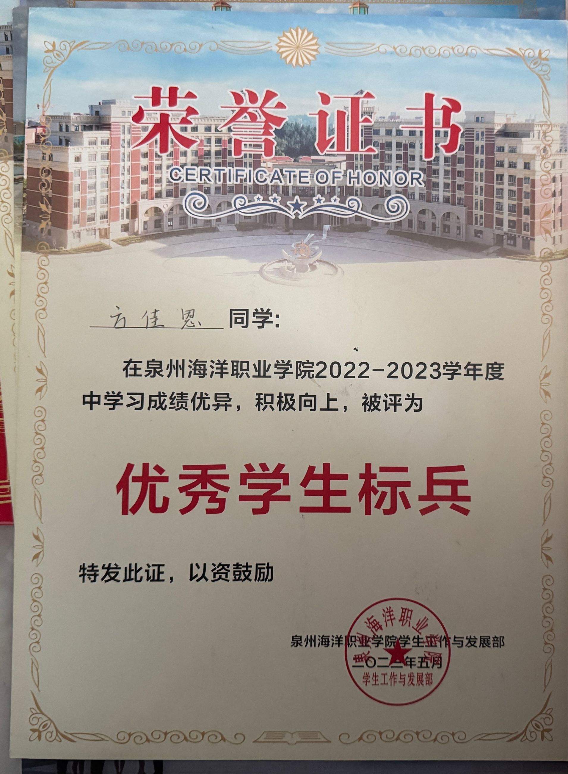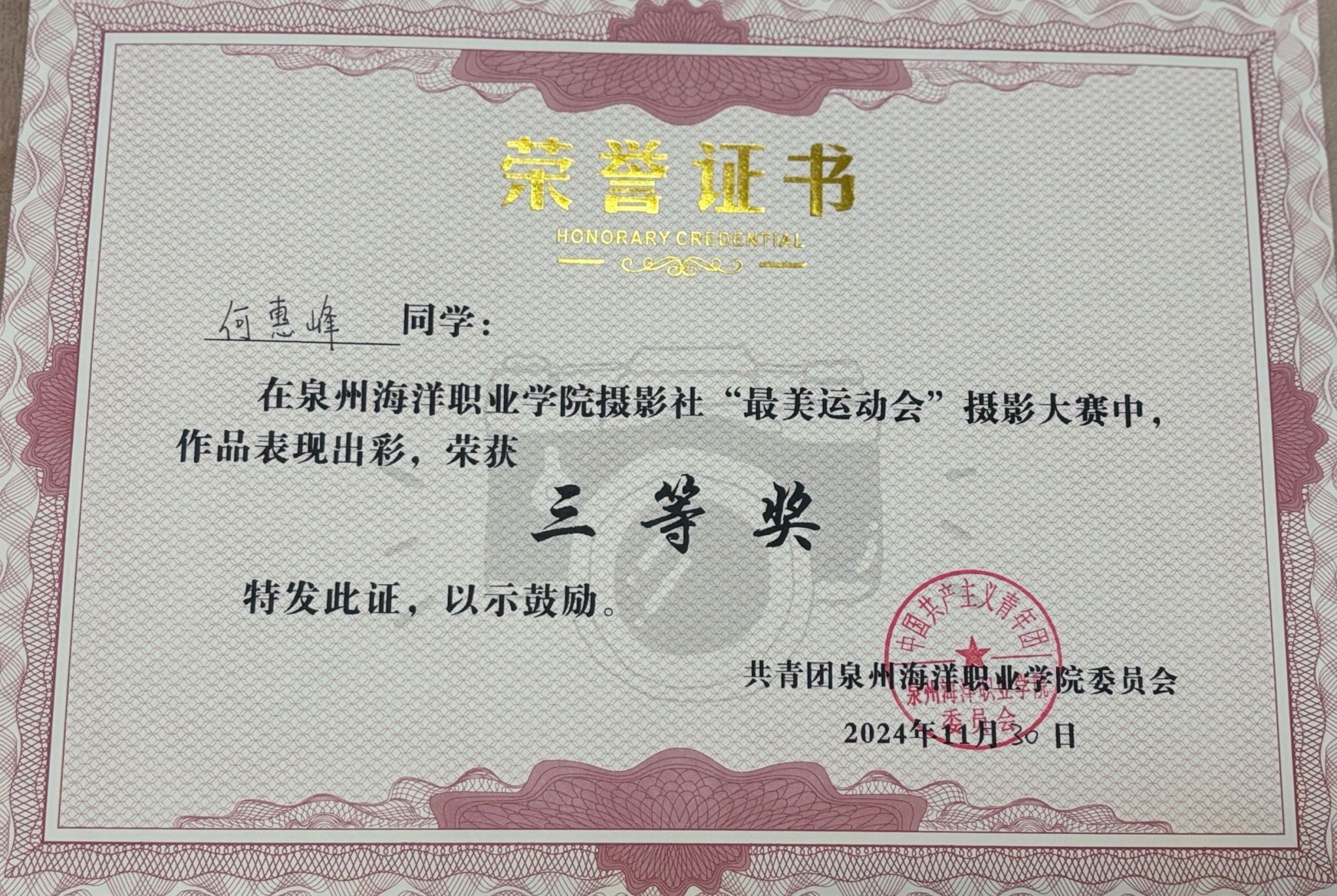 何惠峰,女,共青团员,健康休闲学院护理2307班学生。2024—2025学年专业成绩17/530,综合测评成绩排名5/530。曾获福建省职业院校技能大赛高职组婴幼儿健康养育照护团体优秀奖、泉州海洋职业学院第二届技能比武大赛婴幼儿照护项目三等奖、护理技能项目三等奖、2024—2025学年“优秀学生标兵”等荣誉。持有红十字救护员证、养老护理员证、计算机一级等级等证书。志愿服务时长达100小时。