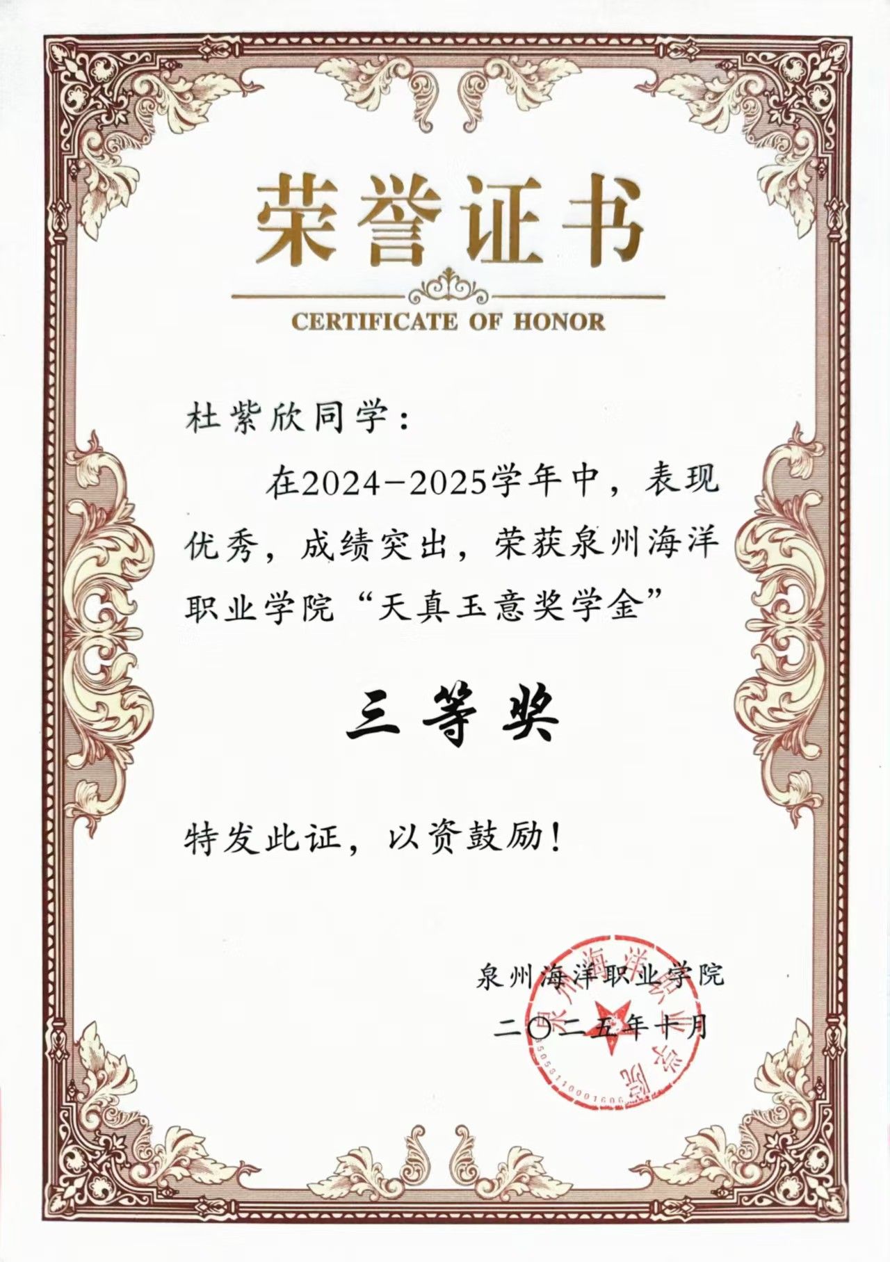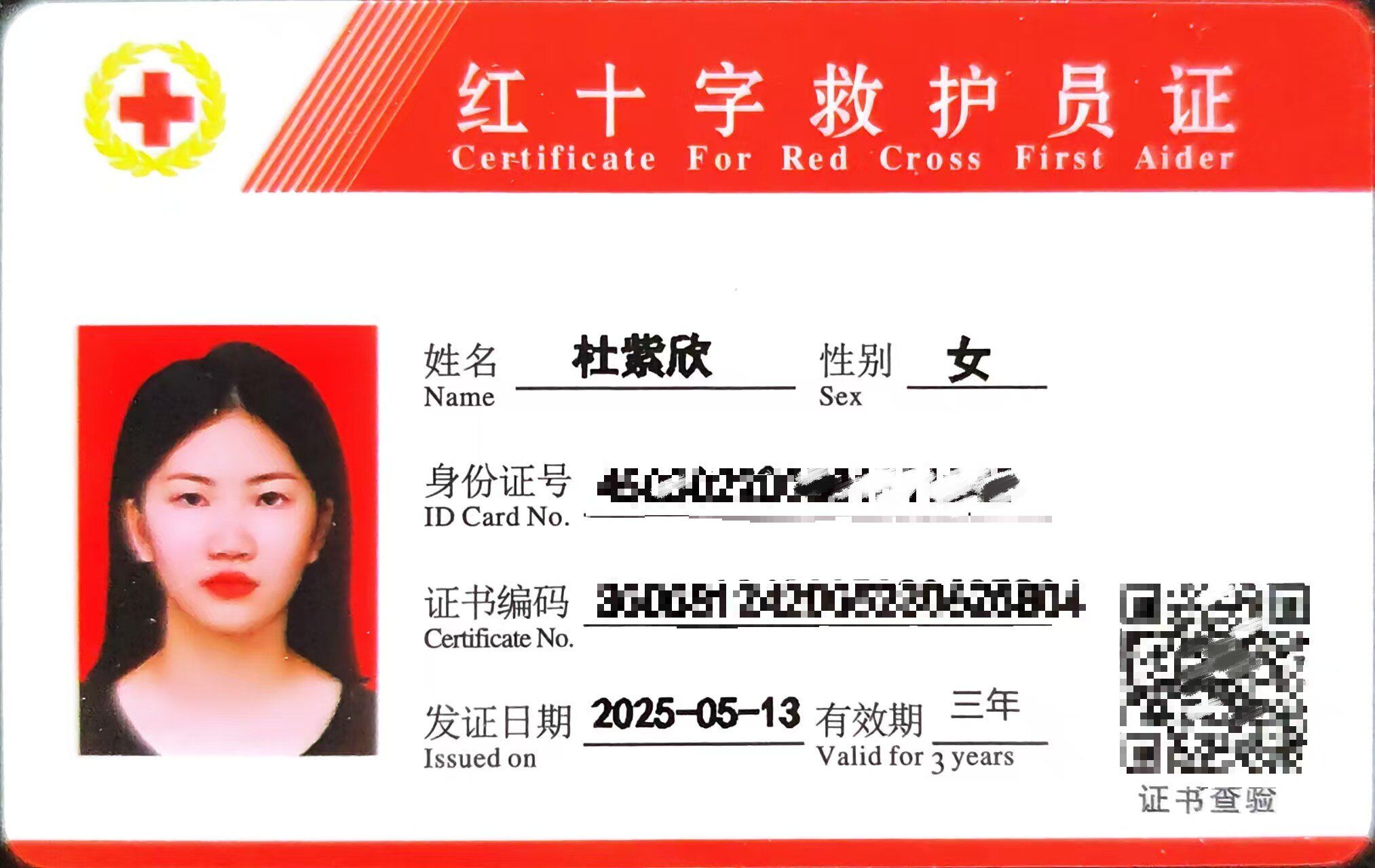 杜紫欣,女,共青团员,健康休闲学院护理2307班学习委员,曾担任校红十字会应急医疗管理中心第一负责人。2024—2025学年专业成绩排名5/530,综合测评成绩排名2/530人。曾荣获泉州海洋职业学“优秀学生干部”“二星级志愿者”等荣誉。持有计算机一级等级证书和红十字救护员证。志愿服务时长达347小时。