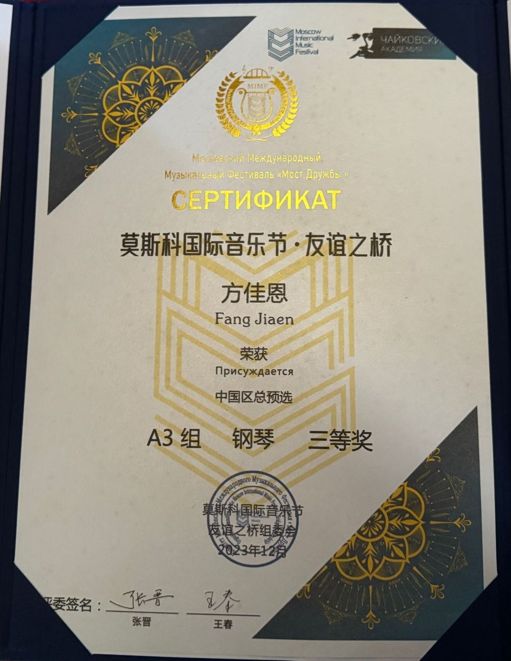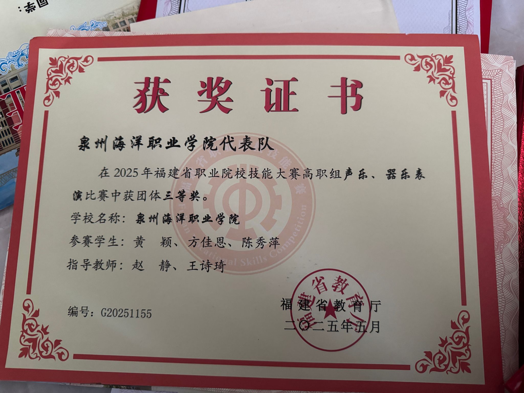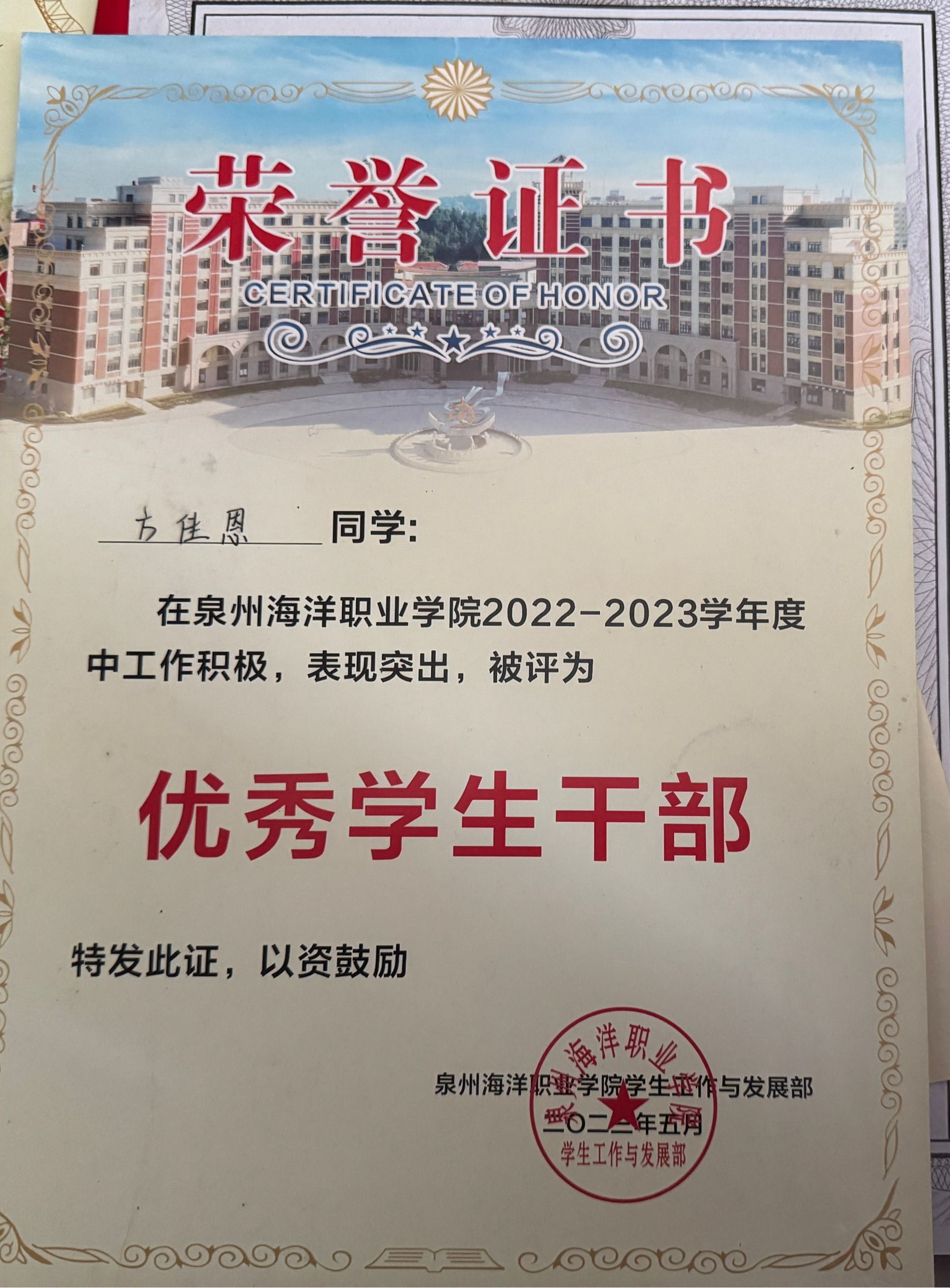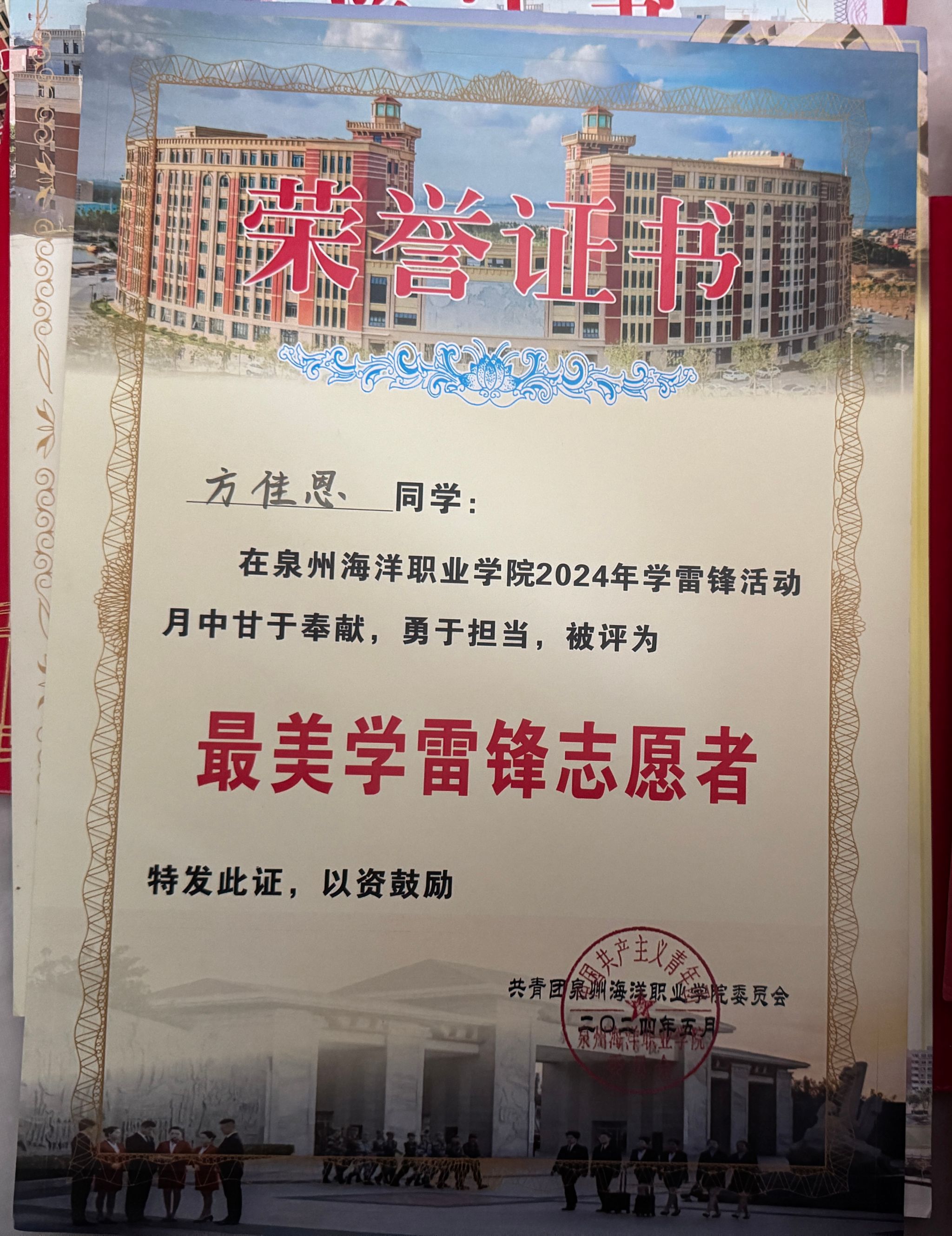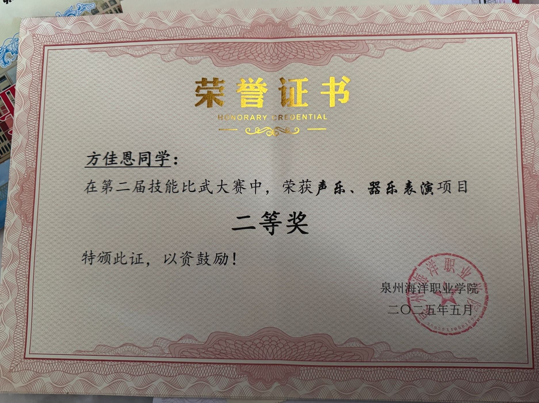 方佳恩,女,共青团员,健康休闲学院表演212班(五年制)班长。2024—2025学年专业成绩排名1/87,综合测评成绩排名1/87。曾获泉州海洋职业学院英语协会“优秀社员”“优秀学生干部”“优秀学生标兵”“最美志愿者”“资助优秀志愿者”等荣誉称号。曾获福建省钢琴协会杯二等奖、莫斯科国际音乐节·友谊之桥中国区总预选三等奖。志愿服务时长595小时。