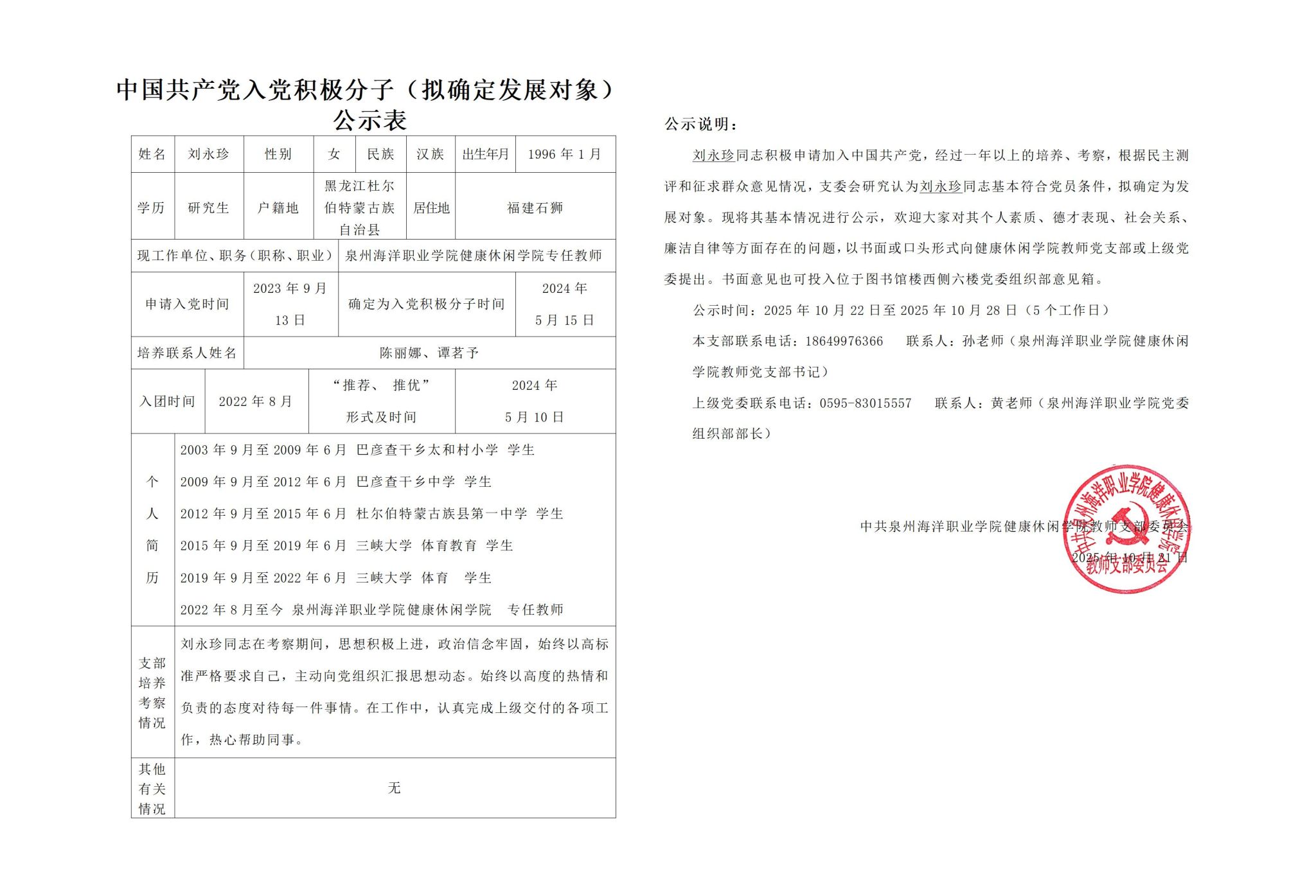 刘永珍同志积极申请加入中国共产党,经过一年以上的培养、考察,根据民主测评和征求群众意见情况,支委会研究,认为刘永珍同志基本符合党员条件,拟确定为发展对象。现将其基本情况进行公示: