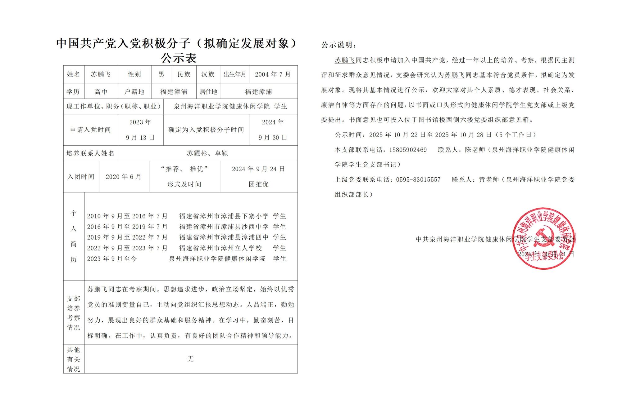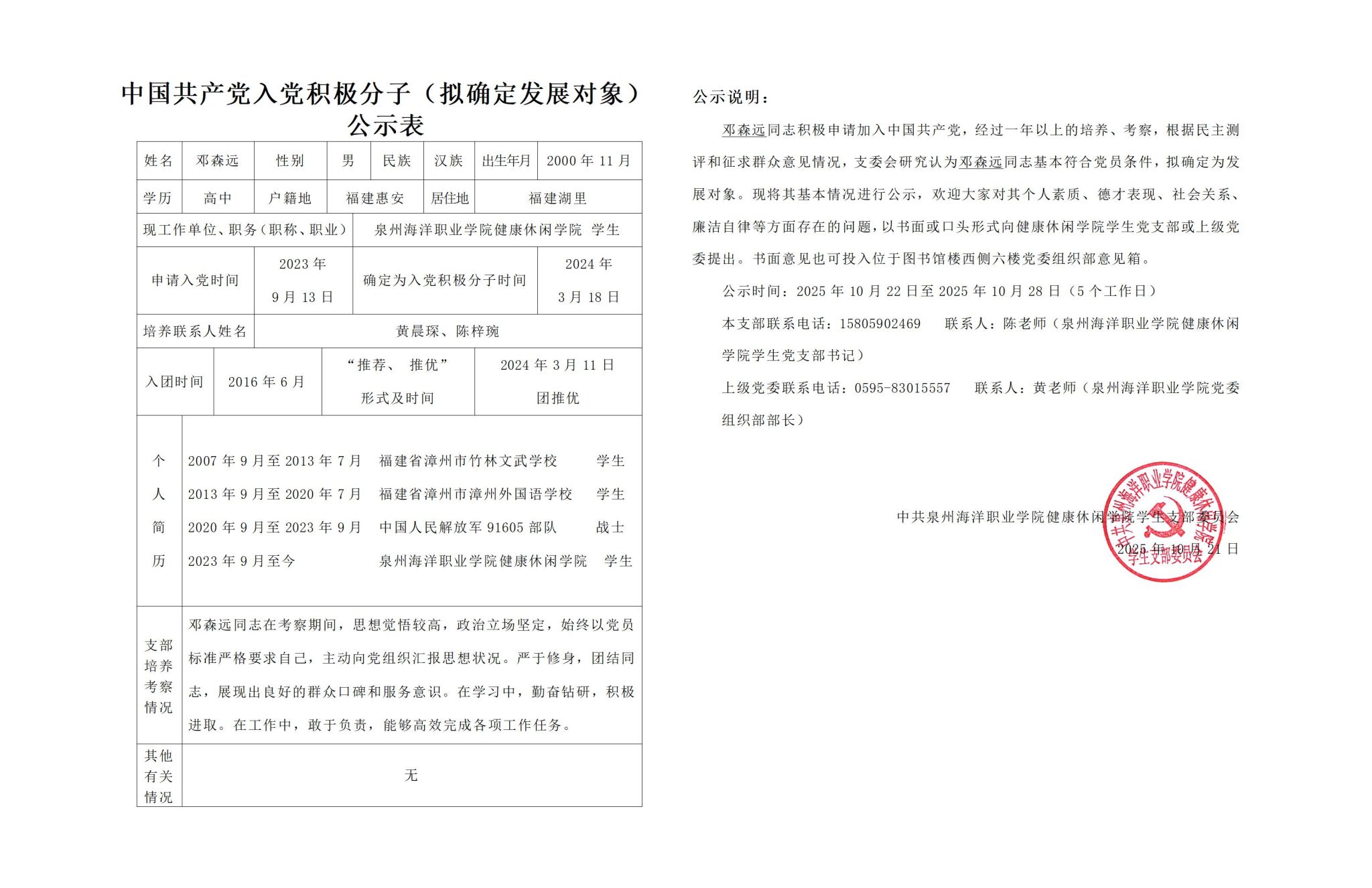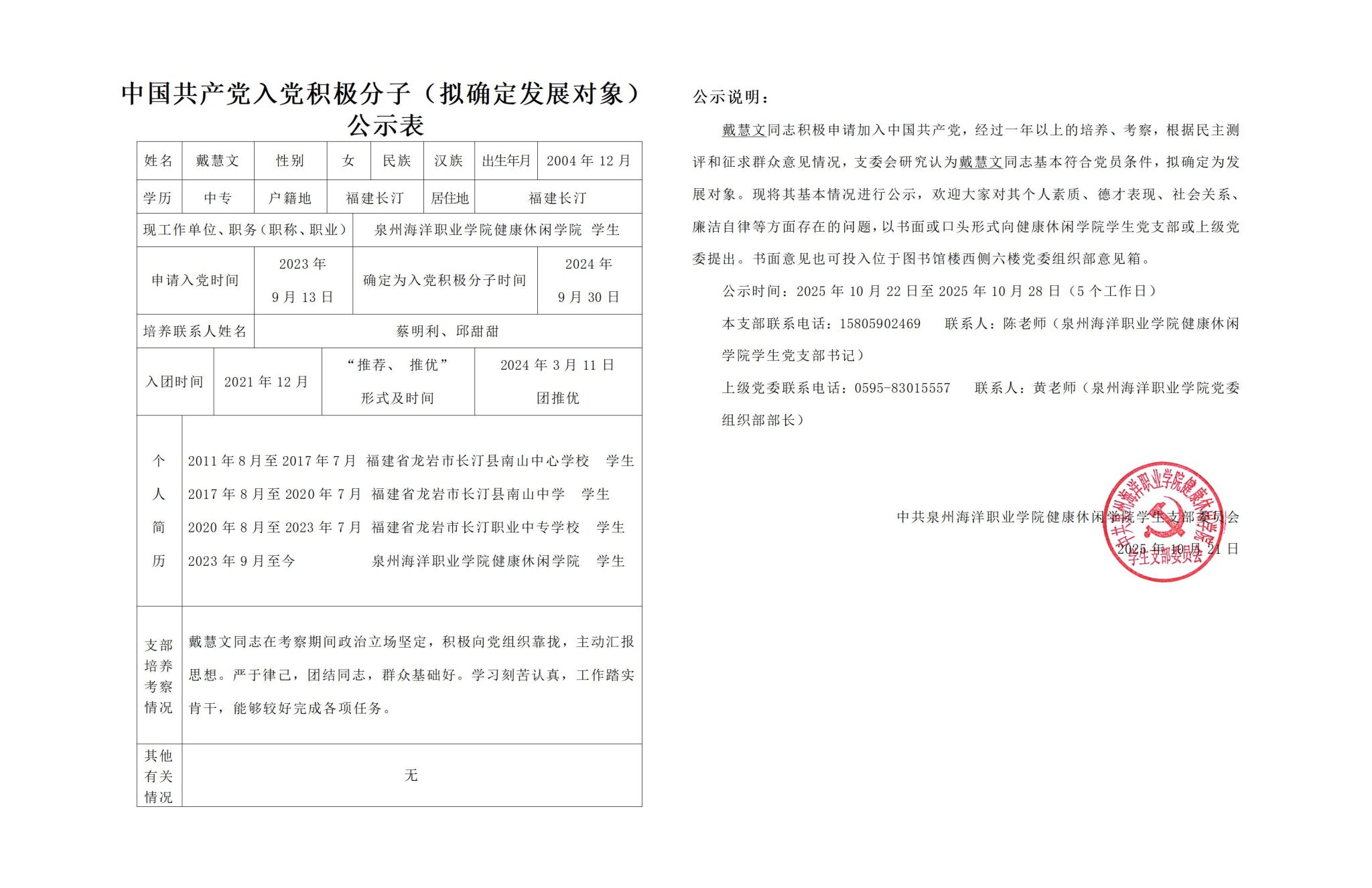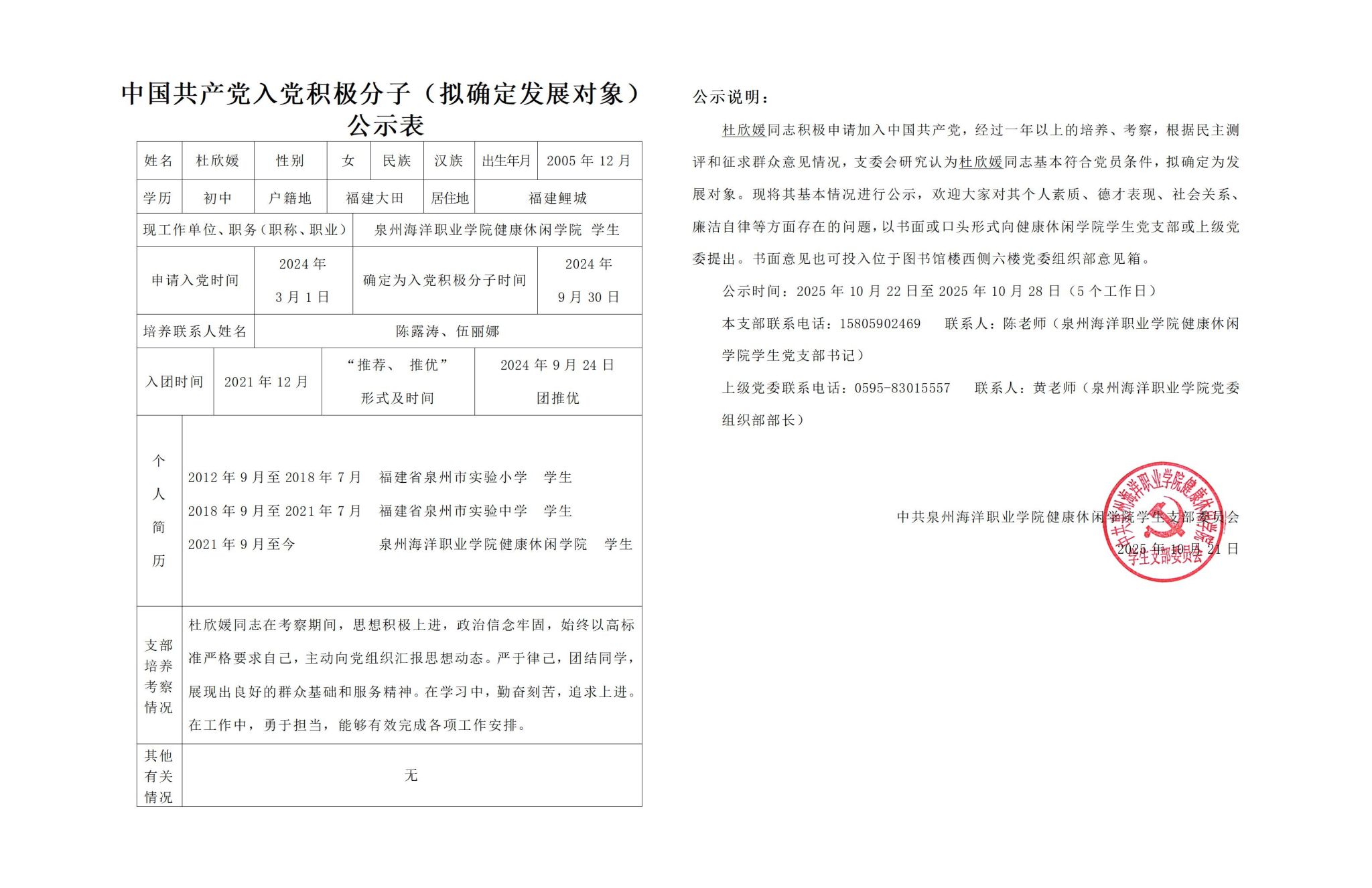 吴懿芯、邓森远、杜欣媛、谷资姨、苏鹏飞、黄得枫、薛梦婷、戴慧文8名同志积极申请加入中国共产党,经过一年以上的培养、考察,根据民主测评和征求群众意见情况,支委会研究,党总支部审议,认为以上8名同志基本符合党员条件,拟确定为发展对象。现将其基本情况进行公示: