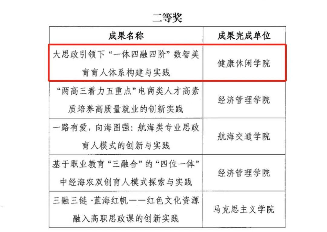 近日,学校公布2026年校级教学成果奖培育评审结果,我院组织申报的《“三层次四融通五融合”陆海复合型健康服务人才培养模式创新与实践》《大思政引领下“一体四融四阶”数智美育育人体系构建与实践》两项教学成果分别荣获一等奖、二等奖。
