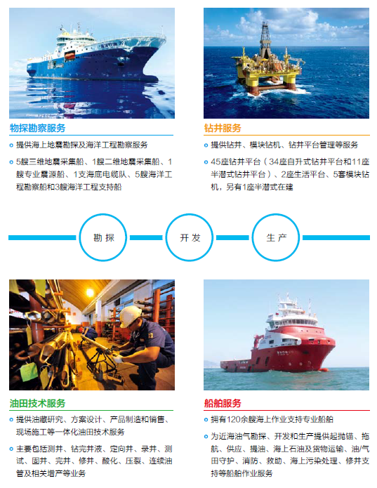 中海油田服务股份有限公司(中海油服, China Oilfield Services Limited 或 COSL)是全球最具规模的综合型油田服务供应商之一,也是亚洲规模最大的油田服务供应商和钻井承包商。公司在沪港上市,拥有50多年海上石油及天然气勘探、开发及生产经验。COSL拥有亚太地区最强大的海上石油服务装备群。中海油服公司的服务区域涵盖中国海域,并拓展至亚太、中东、美洲、欧洲四大区域,覆盖全球30多个国家和地区。中海油田服务股份有限公司业务包括物探勘察、 钻井、 油田技术及船舶四大板块,中海油服拥有完整的服务链条,服务贯穿海上石油及天然气勘探,开发及生产的全过程。