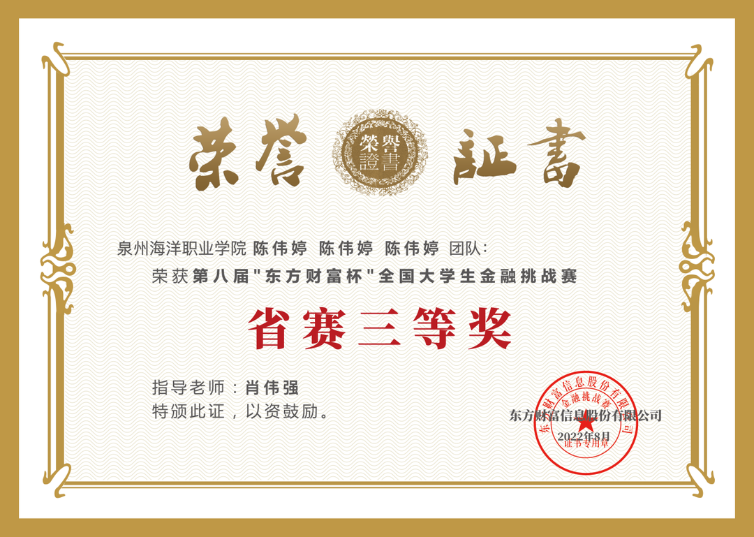 本次比赛进入全国总决赛累计有16091支队伍,仅前3000支队伍能获得由“共青团中央青年发展部”盖章、颁发的荣誉证书,经过近3个月激烈的竞争角逐下,由我校经济管理学院肖伟强老师指导的“朵拉探险记股票”和“泉州海洋8444”2支队伍6名选手经受住了最终考验,过五关,斩六将,实至名归,在全国总决赛中荣获二等奖!