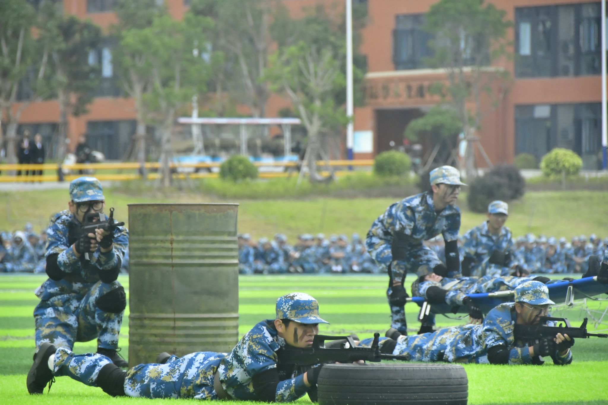 分列式后,精彩的军事科目汇报表演将现场气氛推向高潮。由各学院新生组成的特色方阵先后进行了军体拳、刺杀操、格斗术、战术演练以及富有学校海洋特色的数字方阵、旗语操等科目演示。