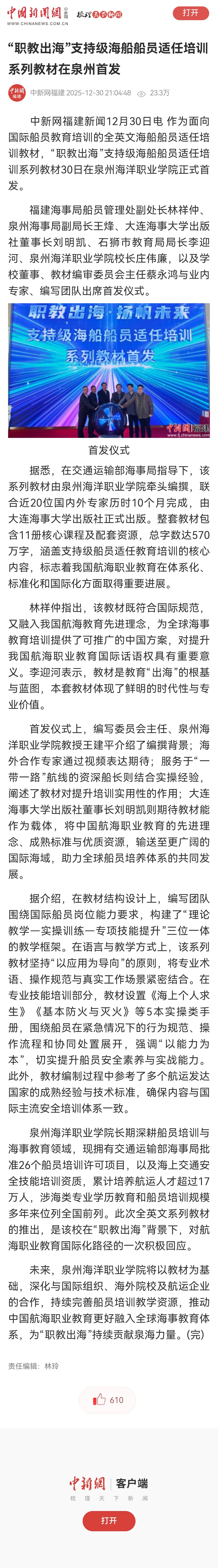 【新华网】职教出海再结硕果 泉州海洋职业学院推出全英文国际船员适任培训教材