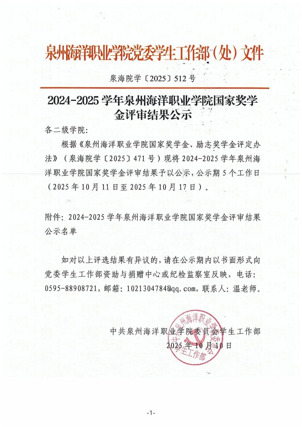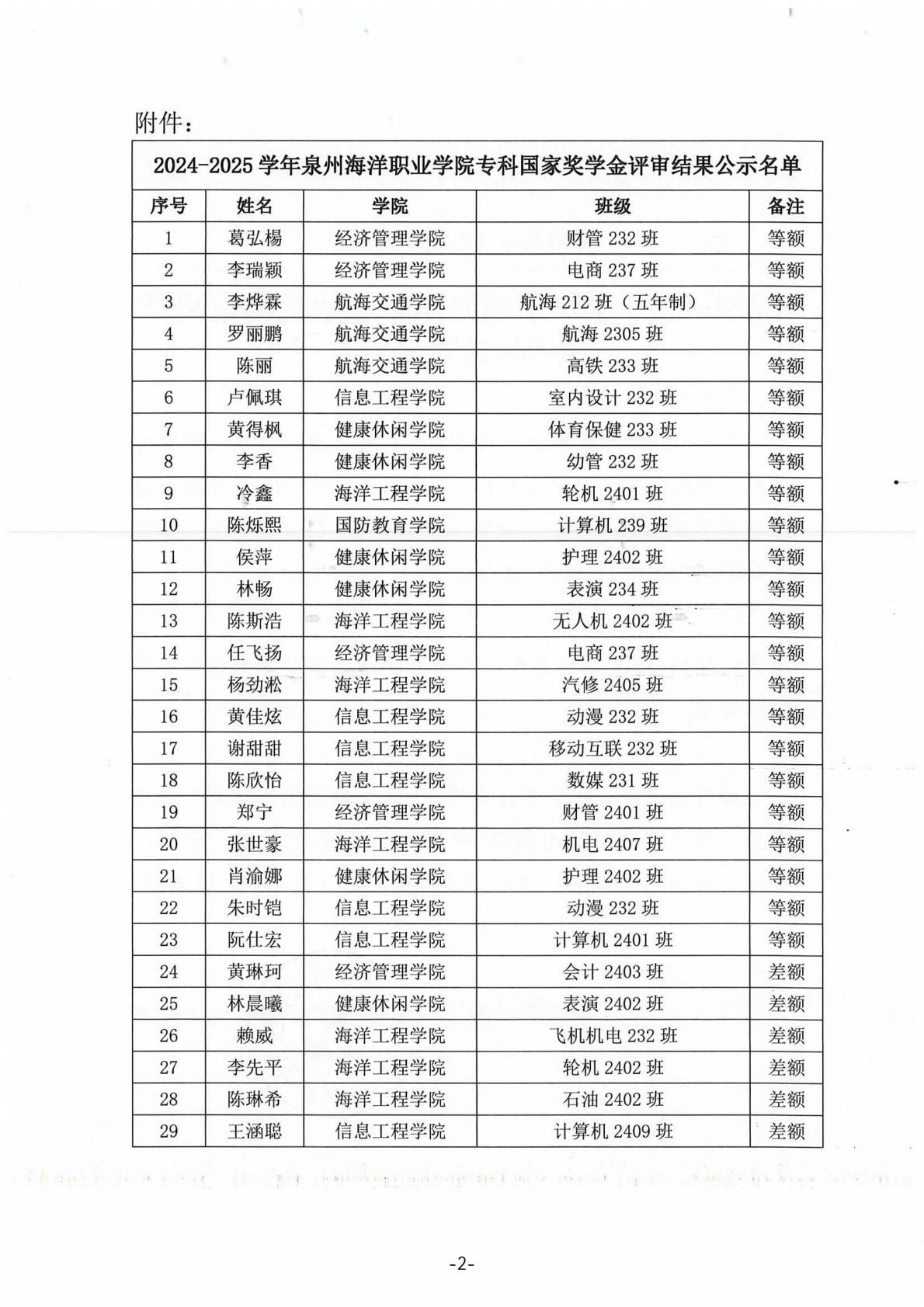 泉州海洋职业学院2024-2025学年泉州海洋职业学院国家奖学金评审结果公示