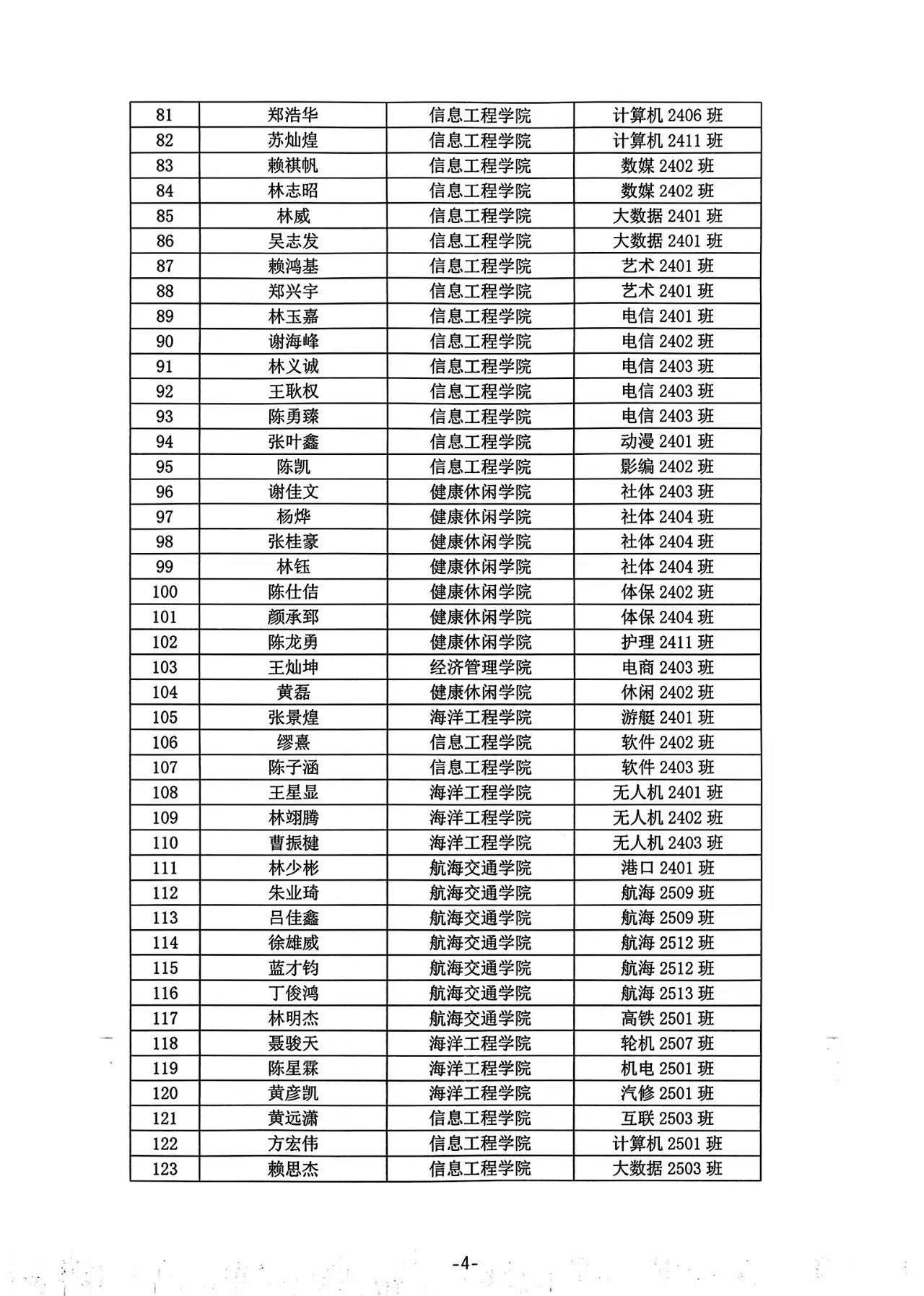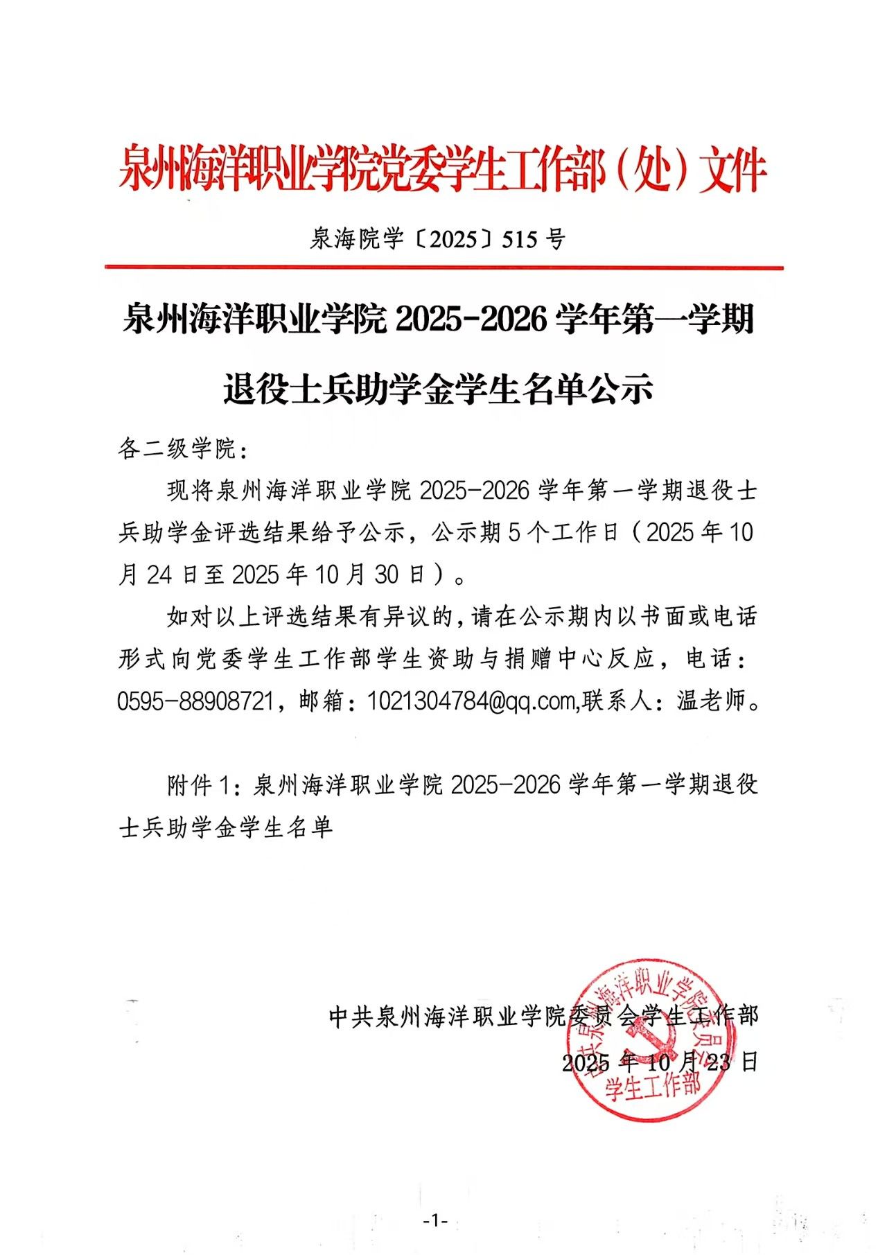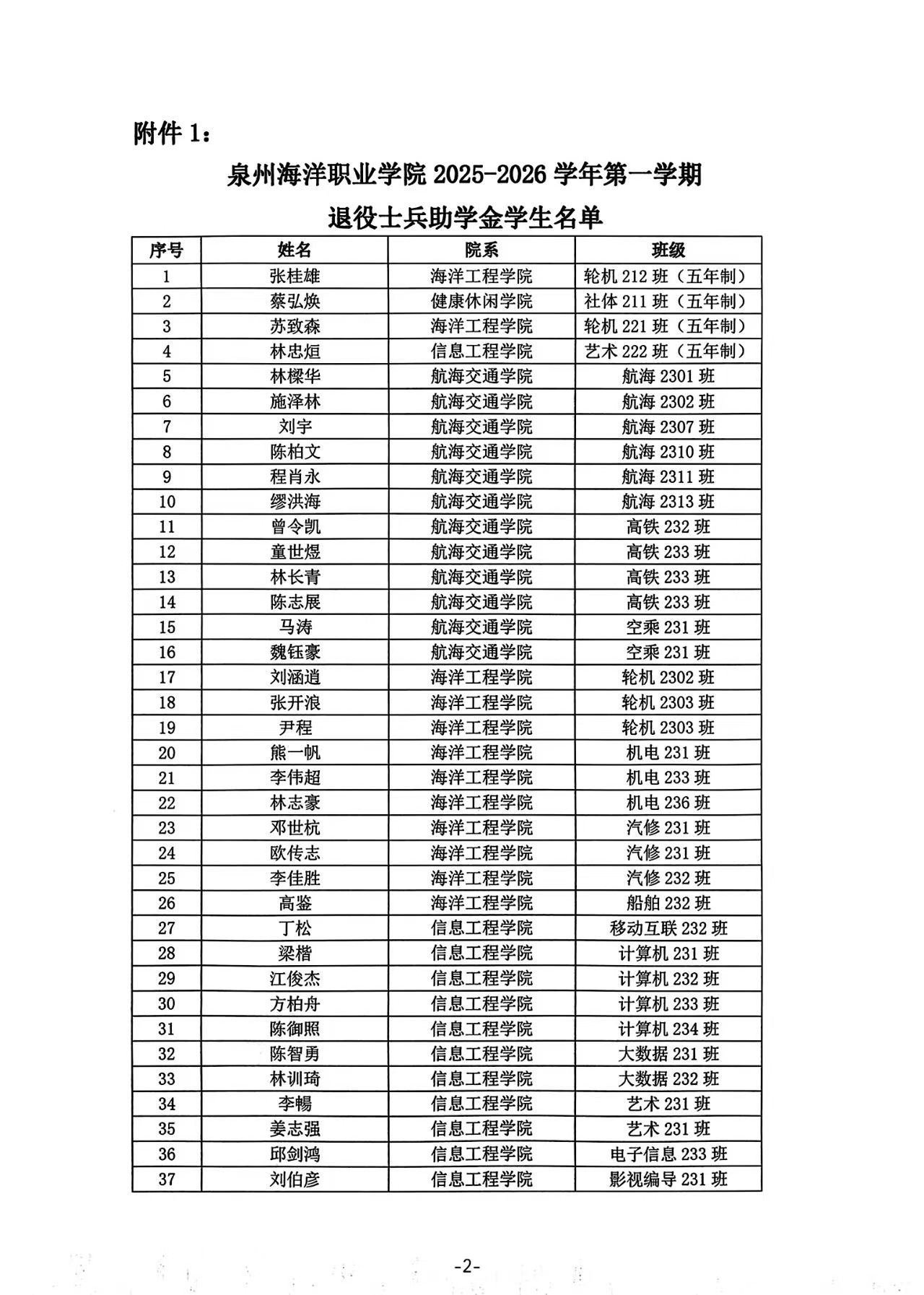 泉州海洋职业学院2025-2026学年第一学期退役士兵助学金学生名单公式