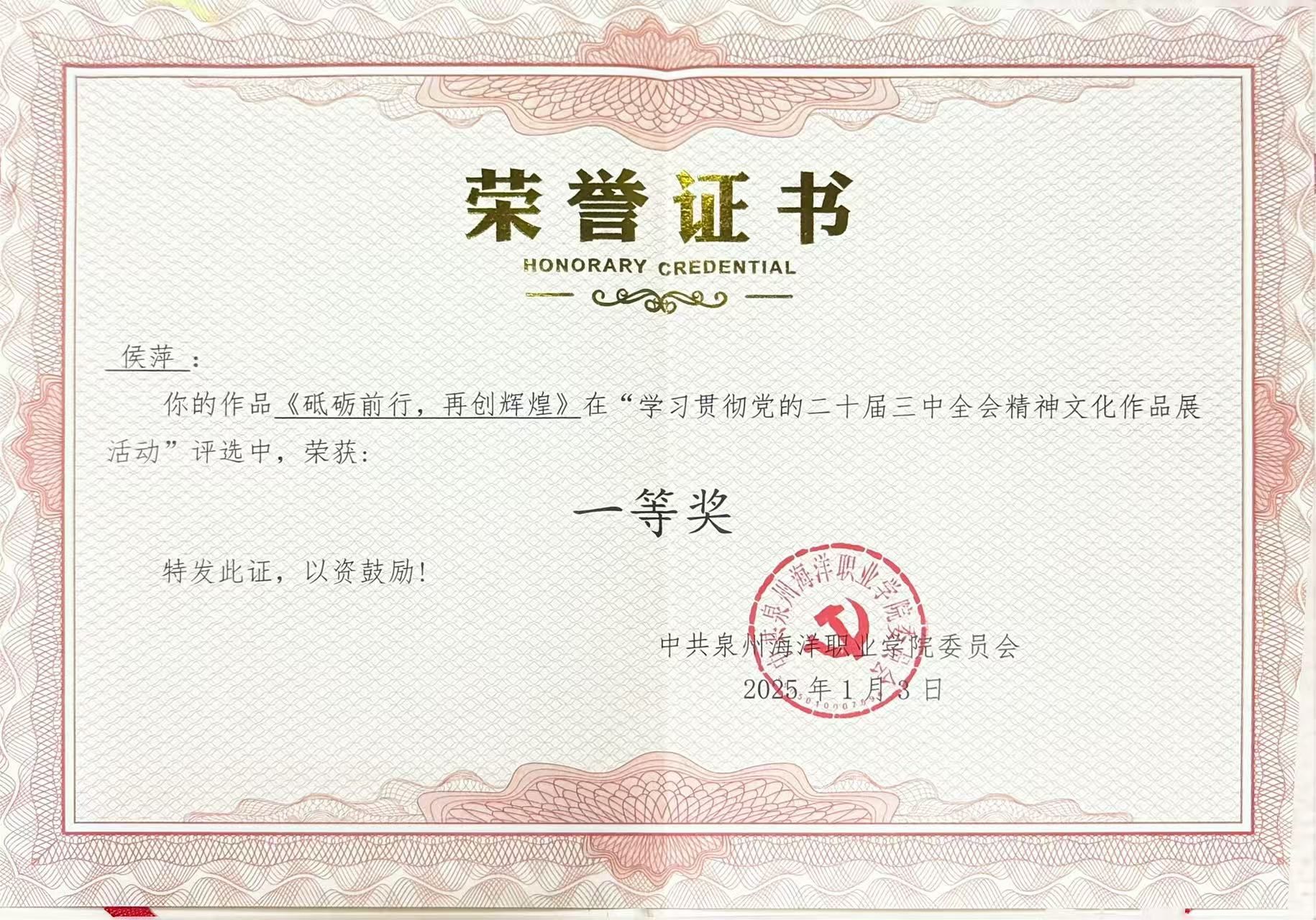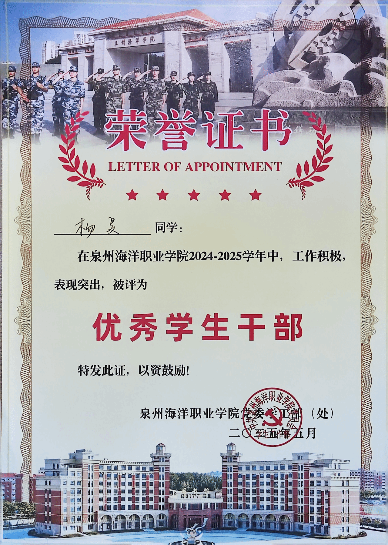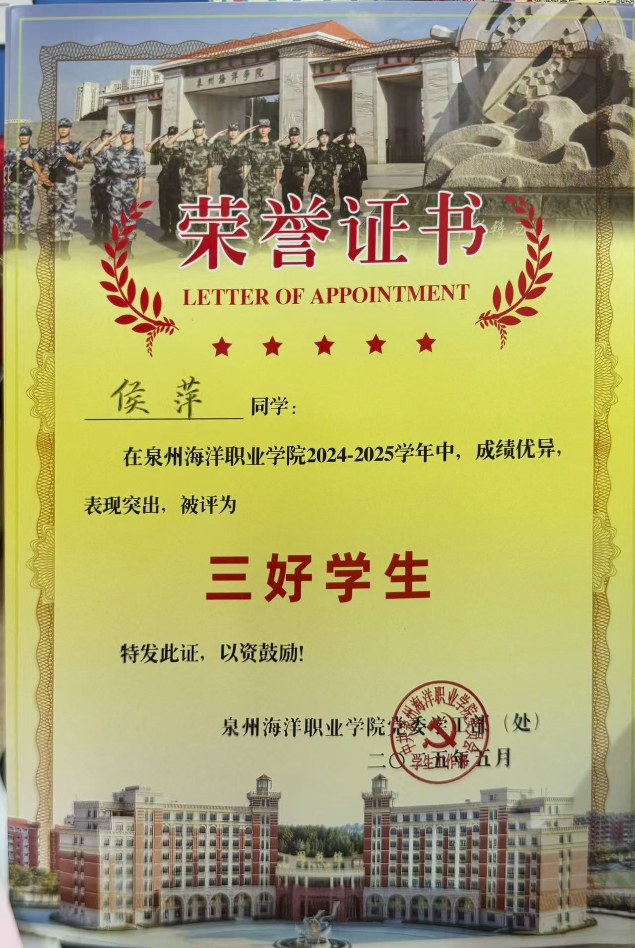 侯萍,女,共青团员,健康休闲学院护理2402班班长,兼任校红十字会副会长。2024—2025学年专业成绩排名1/590,综合测评成绩排名1/590,曾获泉州海洋职业学院“三好学生”、福建省高职高专院校“理论引航 强国有我”大学生理论知识竞赛一等奖、石狮市第七届校园心理情景剧大赛三等奖、泉州海洋职业学院学习贯彻党的二十届三中全会精神文化作品展一等奖等荣誉奖项。持有护士执业资格证、高级育婴师证、中级养老护理员、计算机一级等级等证书。志愿服务时长769小时。