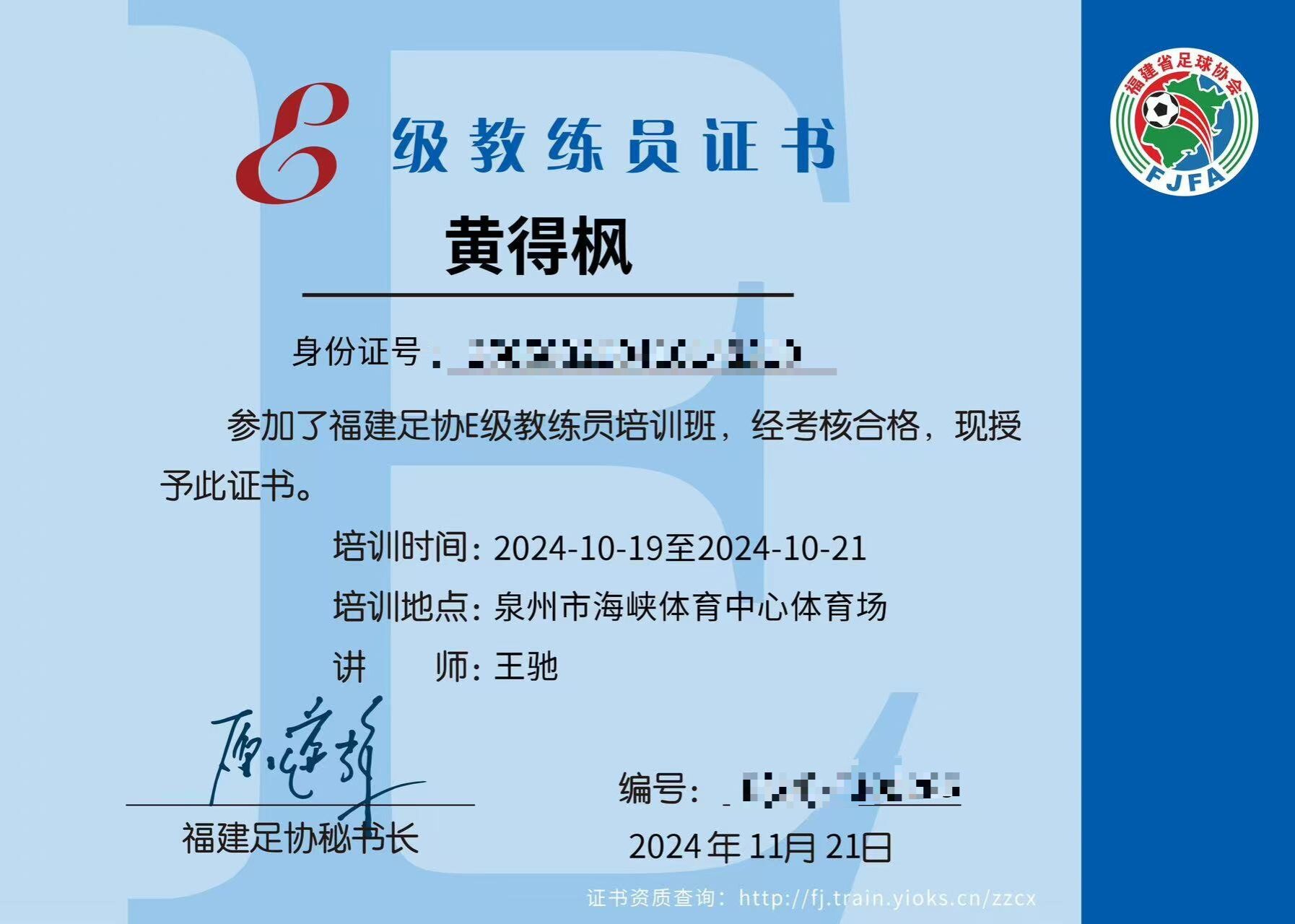 黄得枫,男,共青团员,健康休闲学院体育保健与康复233班学习委员,2024—2025学年专业成绩排名1/156,综合测评成绩排名1/156,曾获福建省职业院校技能大赛高职组康复治疗技术比赛团体优秀奖、泉州市“三好学生”、泉州海洋职业学院“三好学生”、泉州海洋职业学院第二届技能比式大赛传统康复实操项目二等奖、泉州海洋职业学院“新生杯”足球比赛三等奖。曾获国家二级运动员,福建足协E级教练员,红十字救护员,保健推拿等证书。志愿服务时长106.43小时。