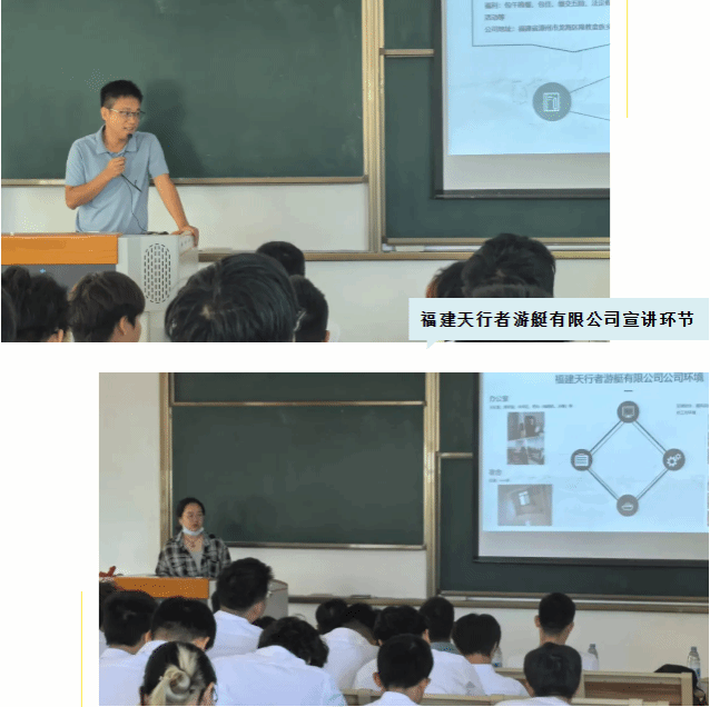 出席本次宣讲的有游艇帆船学院院长施静维、副院长叶文峰,漳州神舟造船工业有限公司的黄铭中总经理,福建天行者游艇有限公司的江祖光总经理、人事资源部王晓虹女士。
